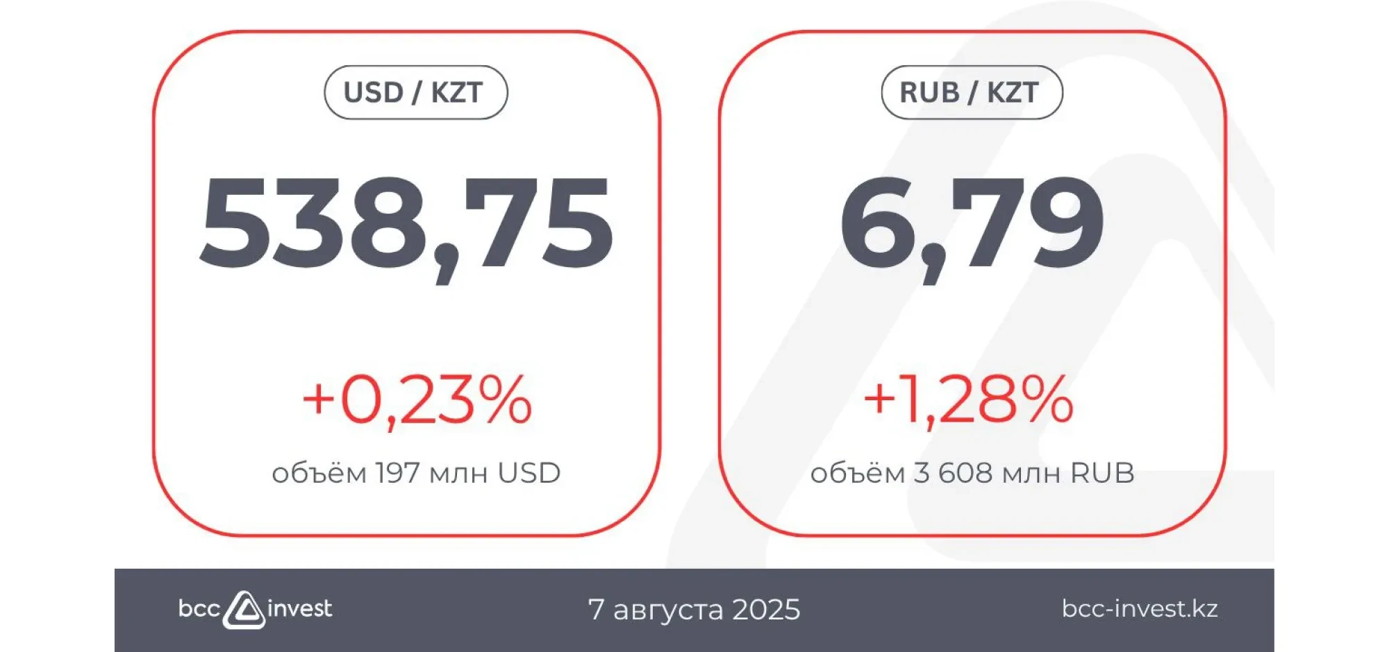 Тенге продемонстрировал небольшое ослабление. Сегодня курс USD/KZT вырос на 0,23% и составил 538,75 ₸, при объёме торгов 197 млн USD.