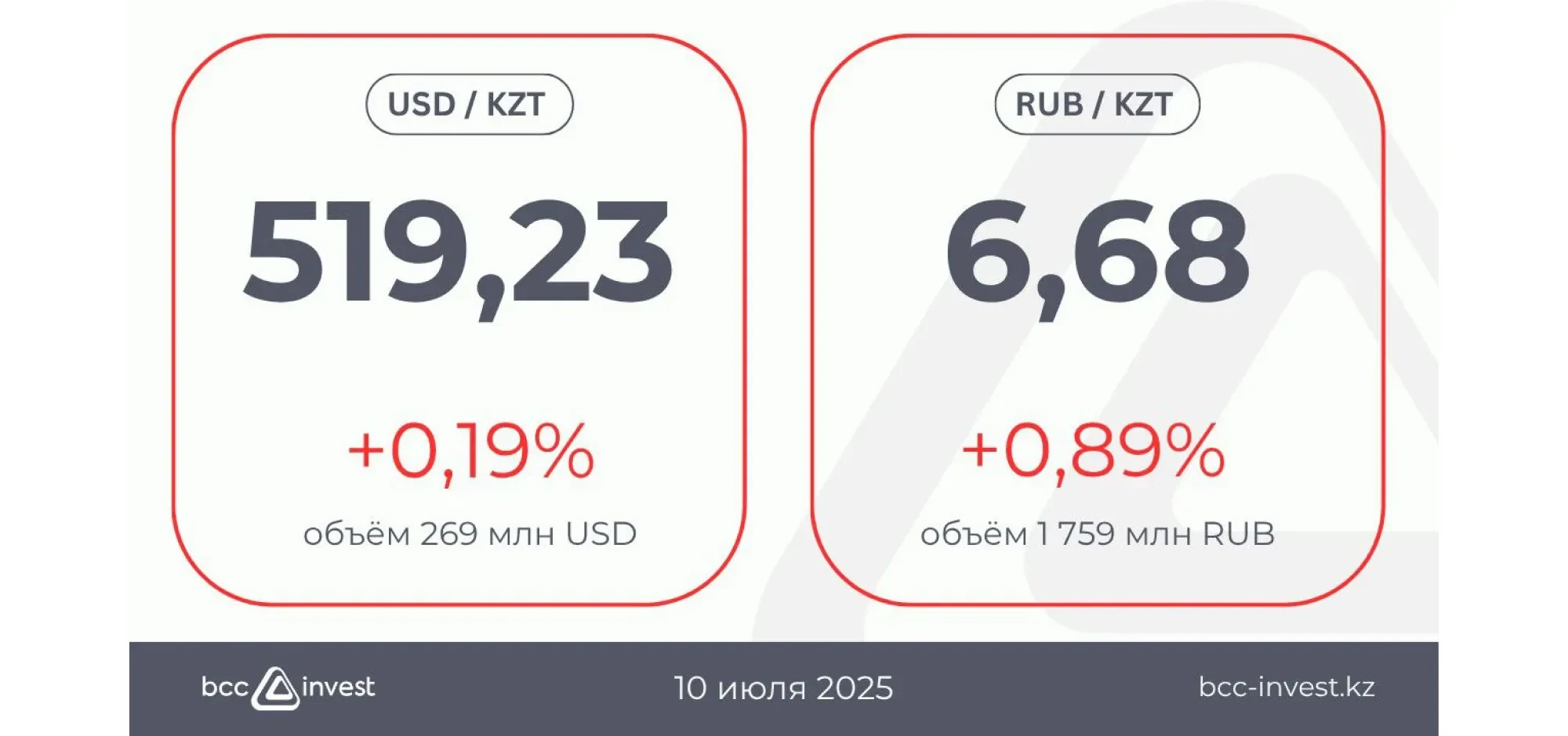 По итогам сегодняшних торгов тенге продемонстрировал ослабление: курс доллара вырос до 519,23 ₸ (+0,19%), а рубль до 6,68 ₸.