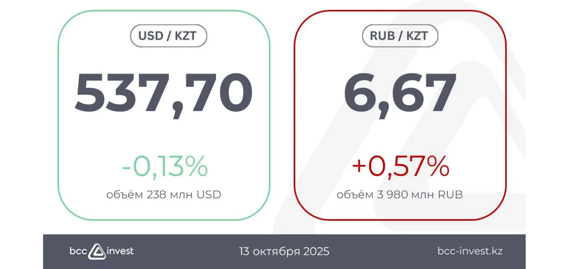 По отношению к рублю курс составил 6,67 ₸ (+0,57%), при этом объём торгов достиг 3 980 млн RUB.