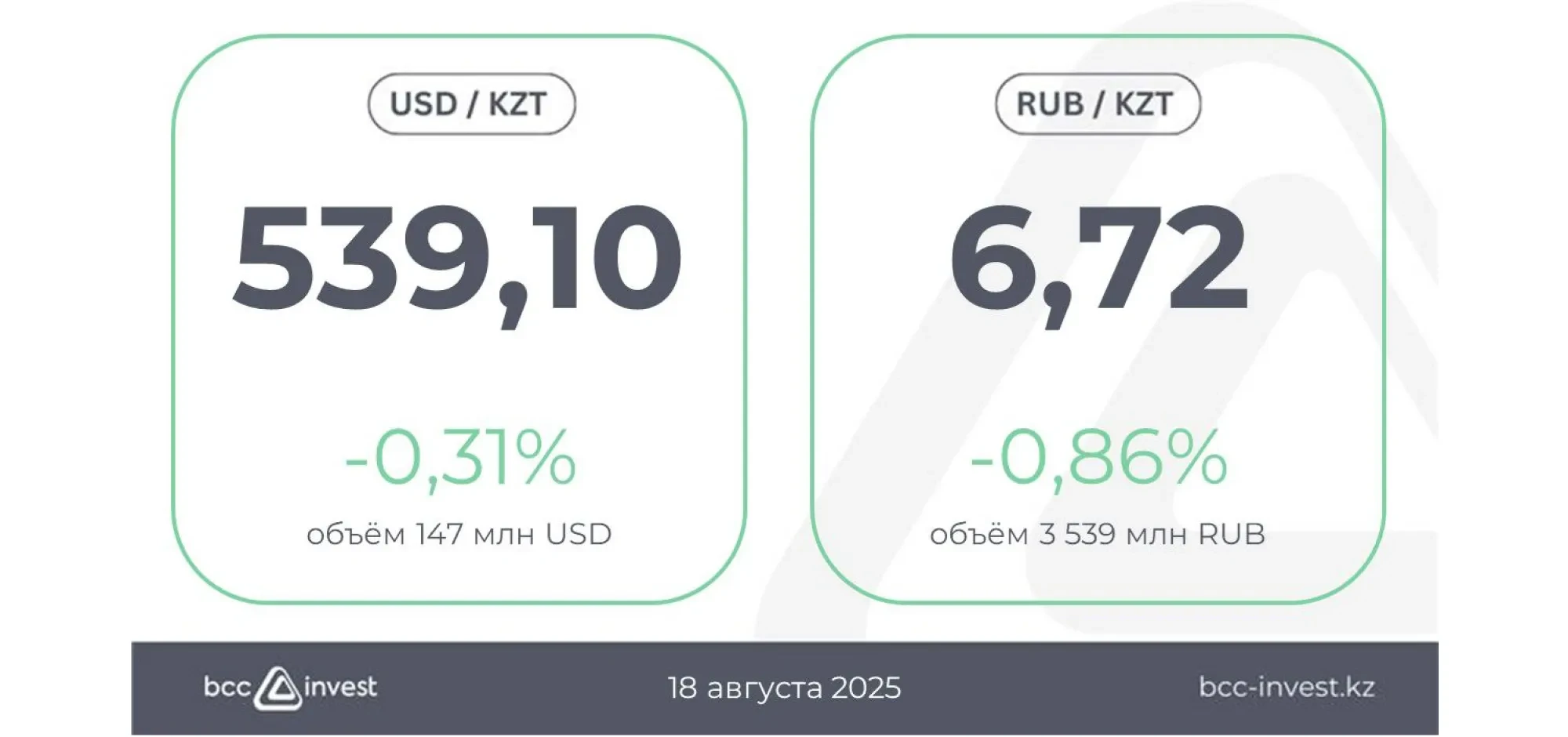 По отношению к рублю курс составил 6,72 ₸ (-0,86%), при этом объём торгов достиг 3 539 млн RUB.