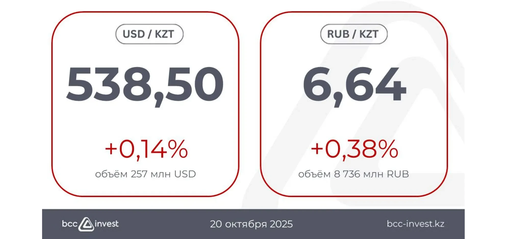 По отношению к рублю курс составил 6,64 ₸ (+0,38%), при этом объём торгов достиг 8 736 млн RUB.