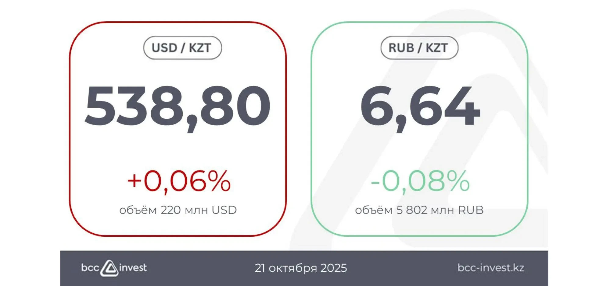 По отношению к рублю курс составил 6,64 ₸ (-0,08%), при этом объём торгов достиг 5 802 млн RUB.