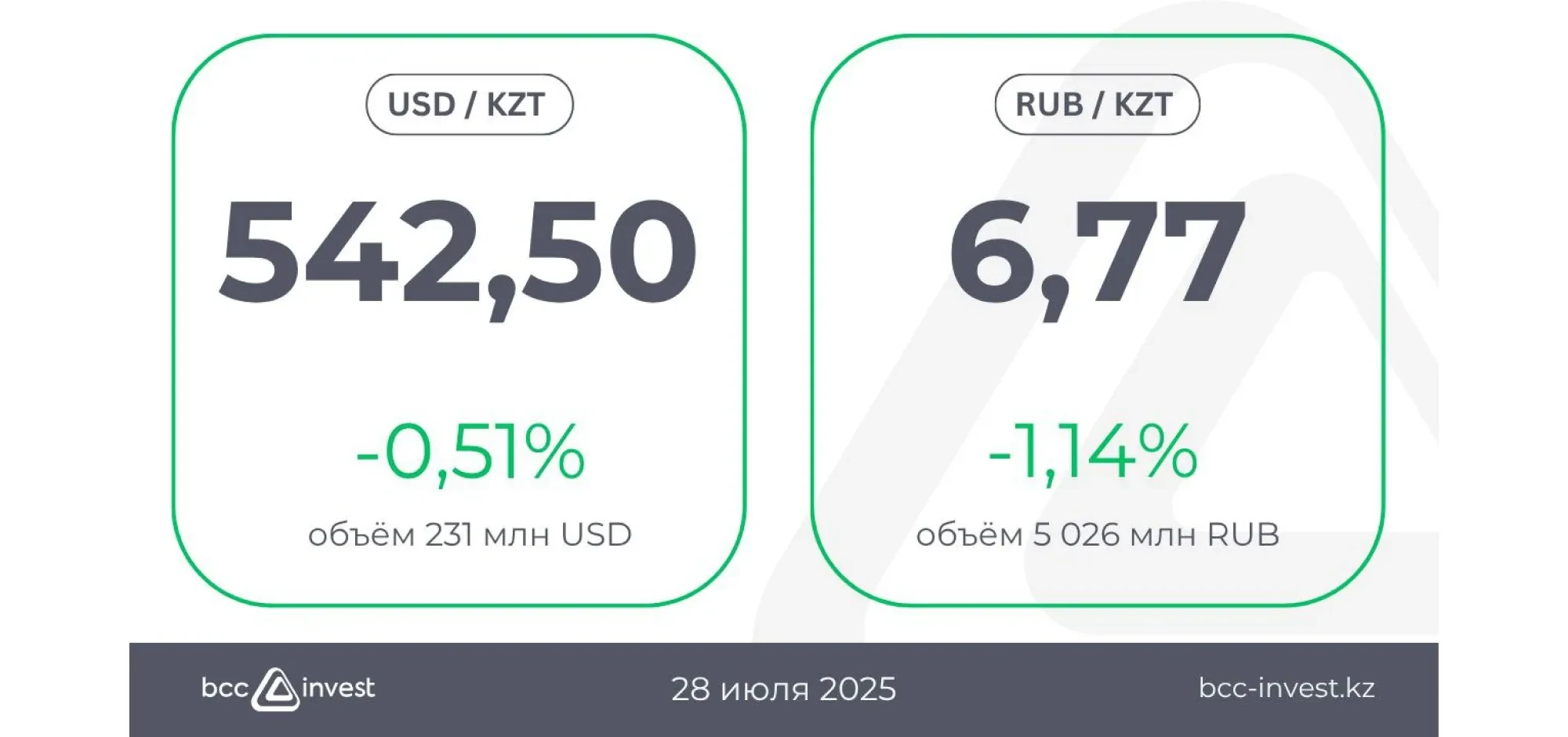 Курс доллара снизился до 542,50 ₸, тенге укрепился на 0,51%, при этом объём торгов составил 231 млн USD.
