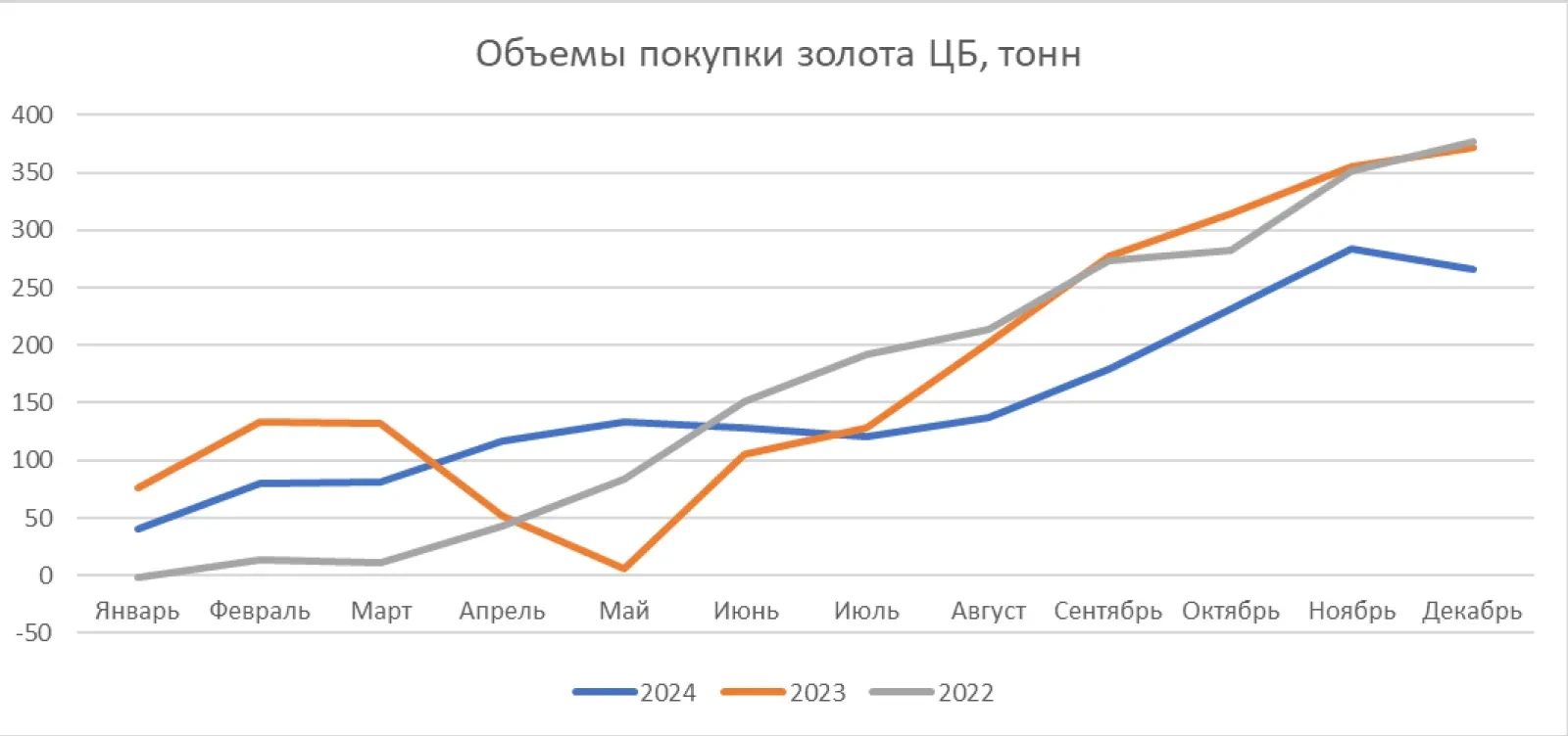 Несмотря на распространенное мнение, что спрос на золото со стороны ЦБ растет, данные говорят об обратном. В 2024 году общий объем покупки золота мировыми центральными банками составил 265 тонн, в то время как в 2023 году объемы составили 371 тонн, а в 2022 – 377 тонн. Центральные банки не заинтересованы в покупке золота по крайне высоким ценам, что приводит к снижению темпов пополнения золотых резервов.