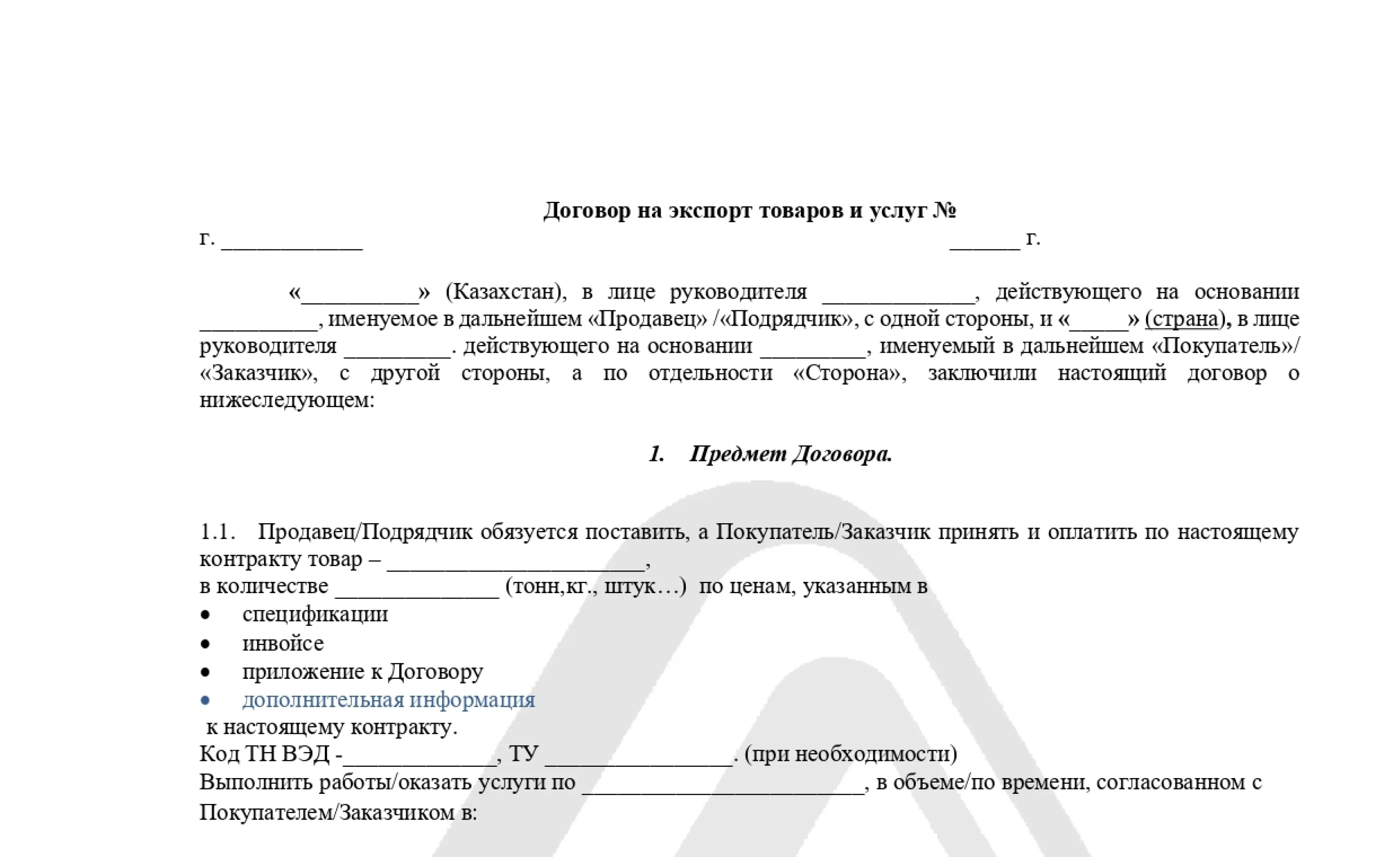 В Казахстане установлена типовая форма контракта — образец договора на экспорт товаров и услуг вы можете скачать на этой странице сайта. В документе подробно описывают характеристики товаров и услуг, указывают права и обязанности сторон, ответственность за несоблюдение условий, порядок действия в непредвиденных обстоятельствах, сроки и порядок оплаты (например, с предоплатой).