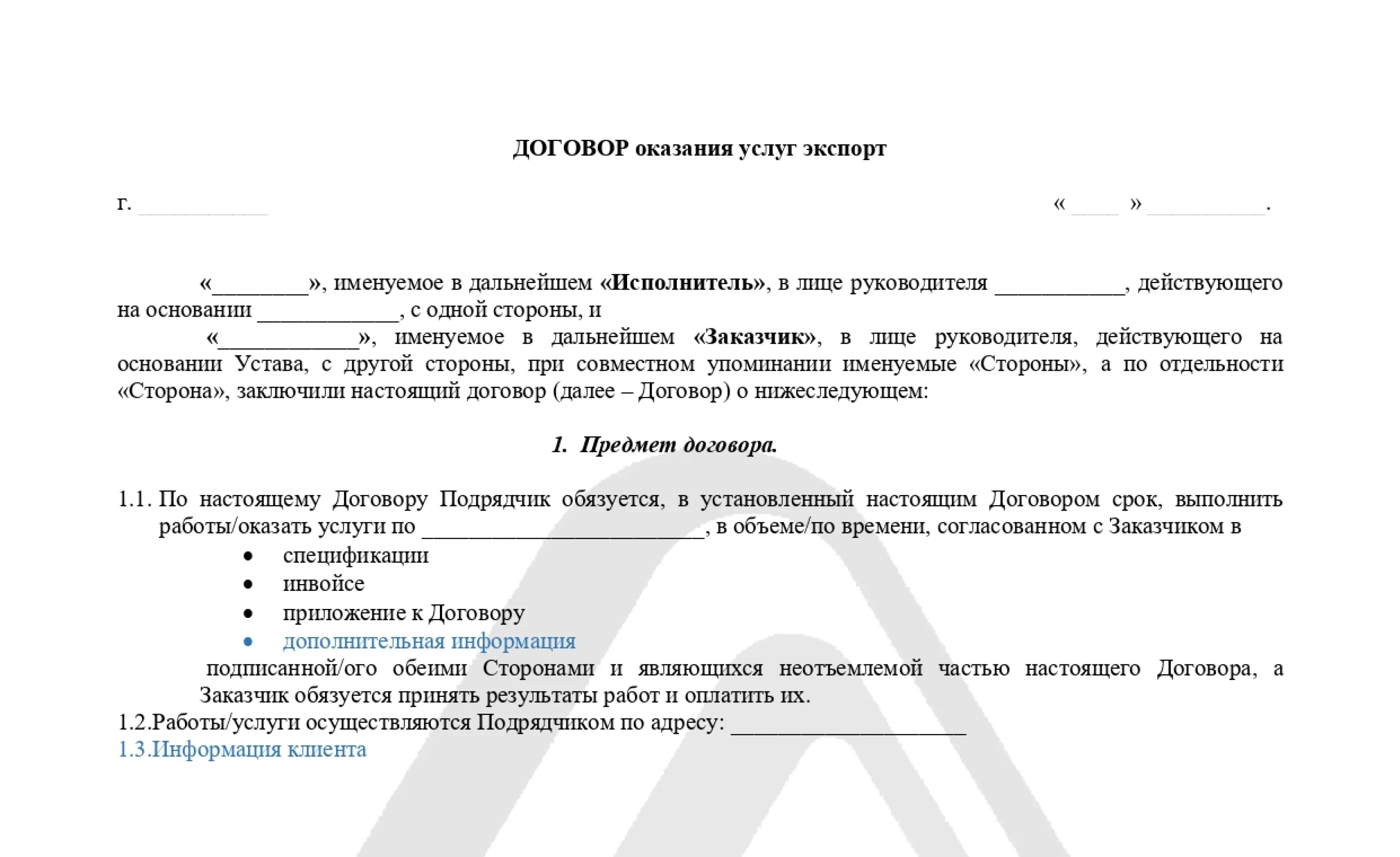 Контракт регулирует все аспекты сделки. В первую очередь фиксирует обязательства экспортёра оказать услуги, а импортёра — оплатить их. Кроме того, документ — это гарант защиты интересов обеих сторон в спорных ситуациях.