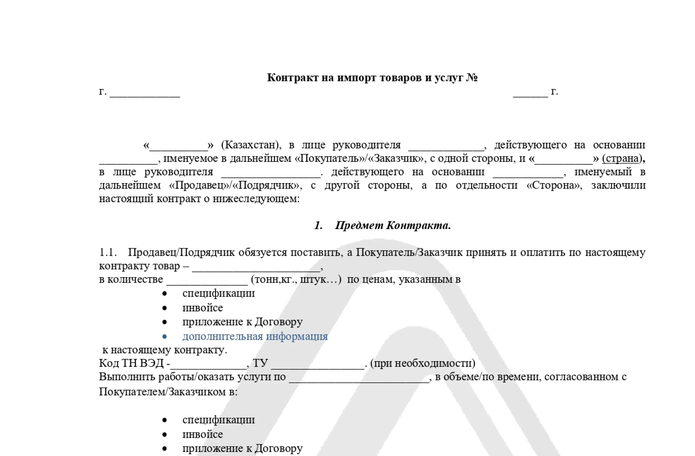 Документ имеет типовую форму, установленную в Казахстане. Скачать образец внешнеторгового контракта можно на нашем сайте: заполните предложенные графы и распечатайте документ в двух экземплярах.