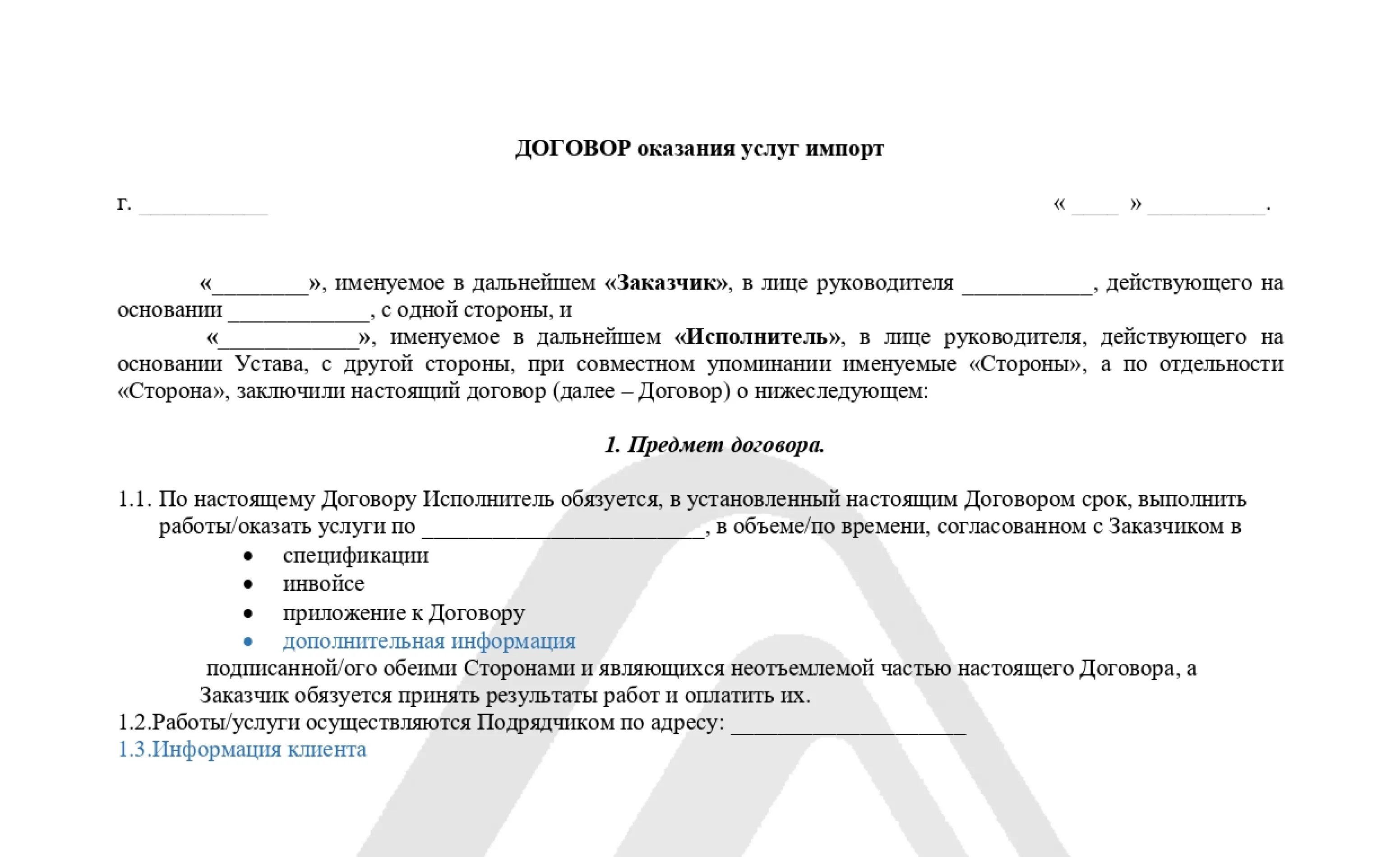 В Казахстане для контракта предусмотрена типовая форма — скачать образец договора на импорт услуг вы можете прямо в этом разделе сайта. Заполните предложенные графы, распечатайте документ в двух экземплярах и заверьте его подписями продавца и покупателя.