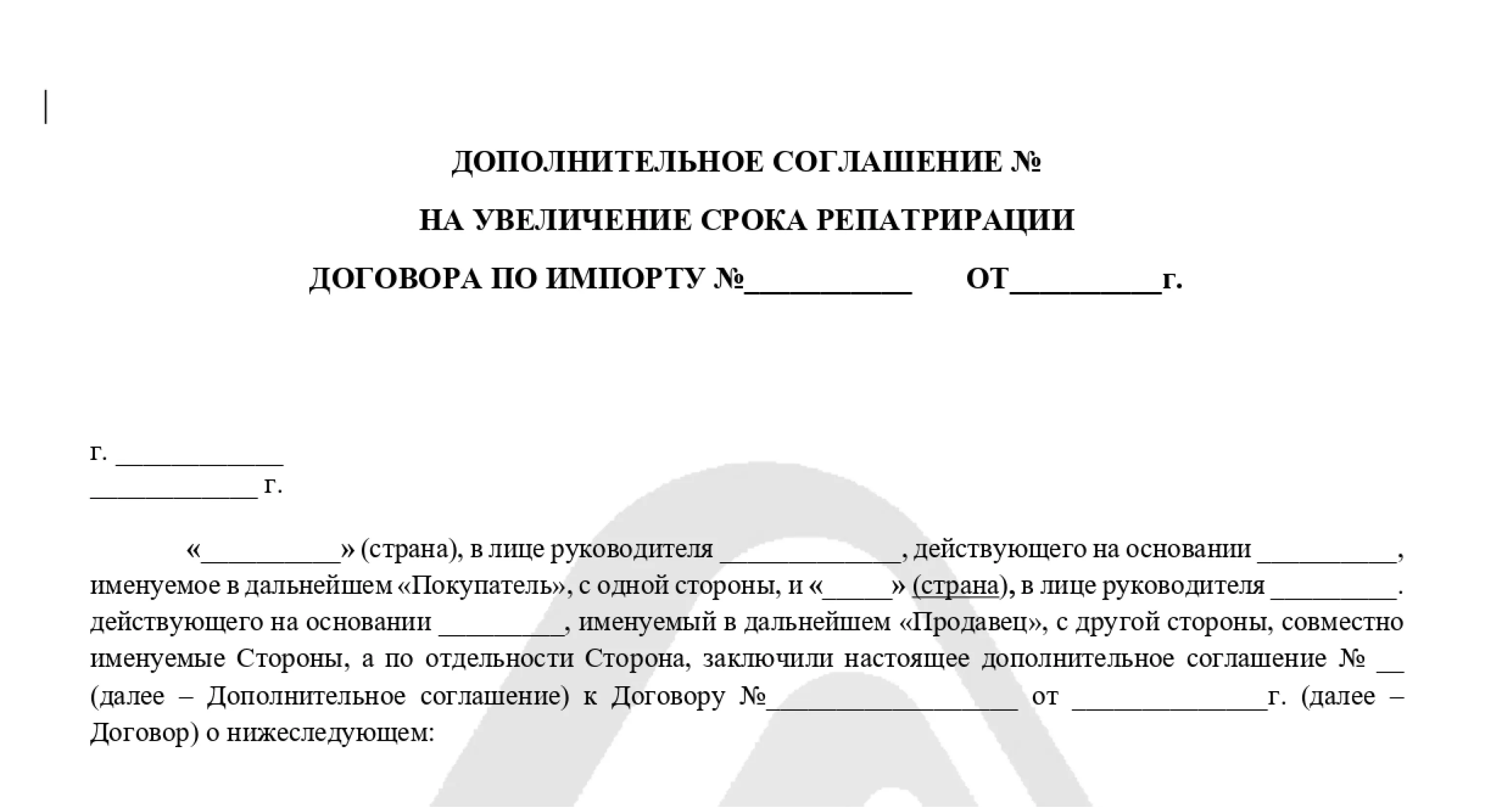 Документ в Казахстане готовится на основе типовой формы. Скачать образец ДС на увеличение срока репатриации договора по импорту можно на нашем сайте за пару кликов.