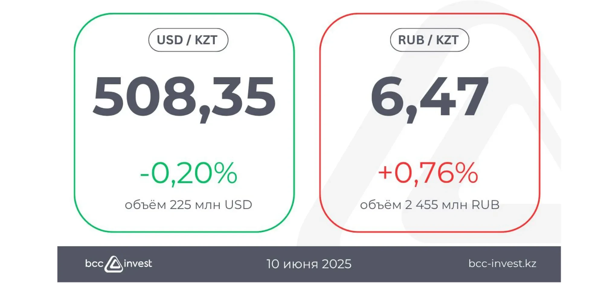 Сегодня курс тенге к доллару США продолжил укрепляться: USD/KZT снизился на 0,20% до 508,35 при объёме торгов в 225 млн долларов.