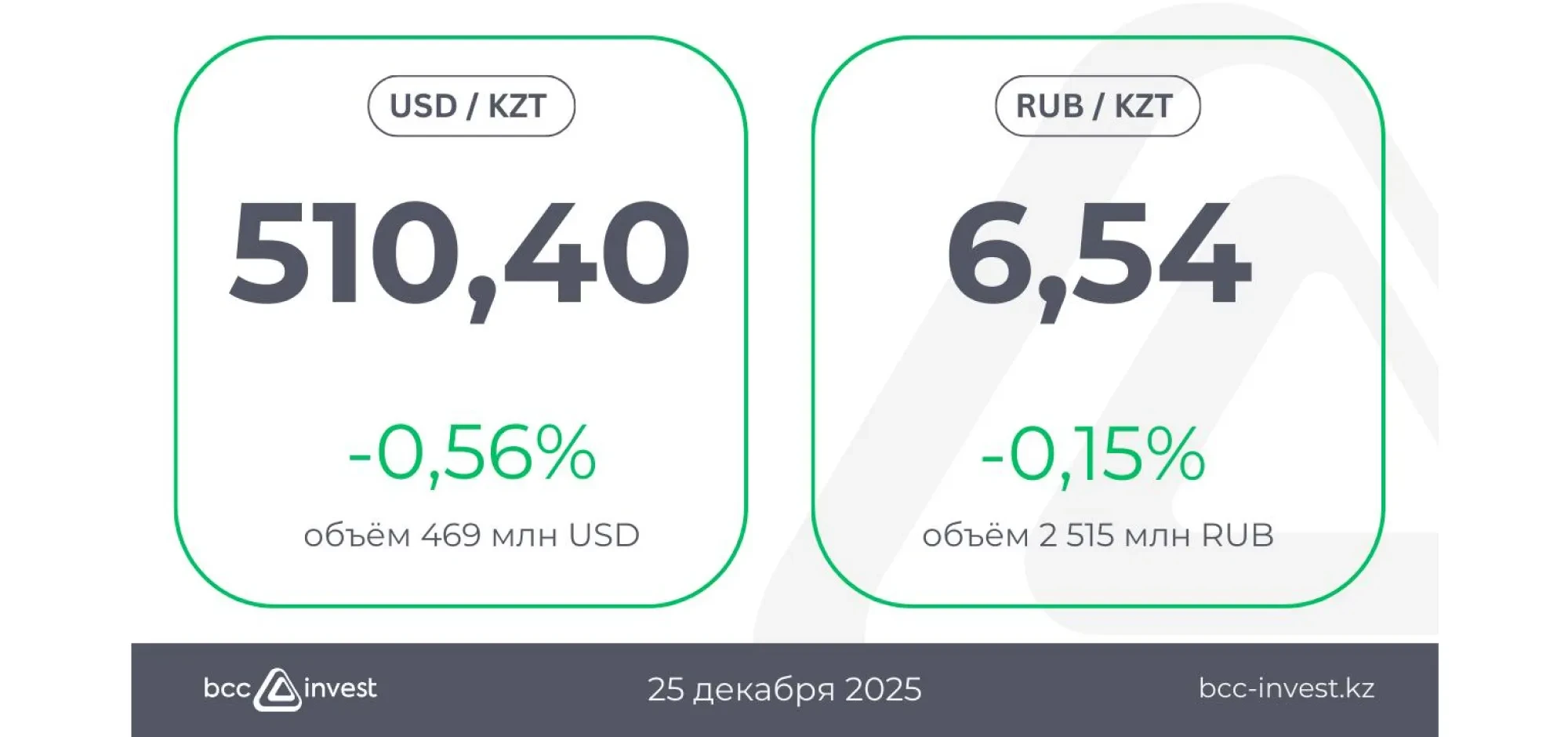 По отношению к рублю курс составил 6,54 ₸ (-0,15%), при этом объём торгов достиг 2 515 млн RUB.