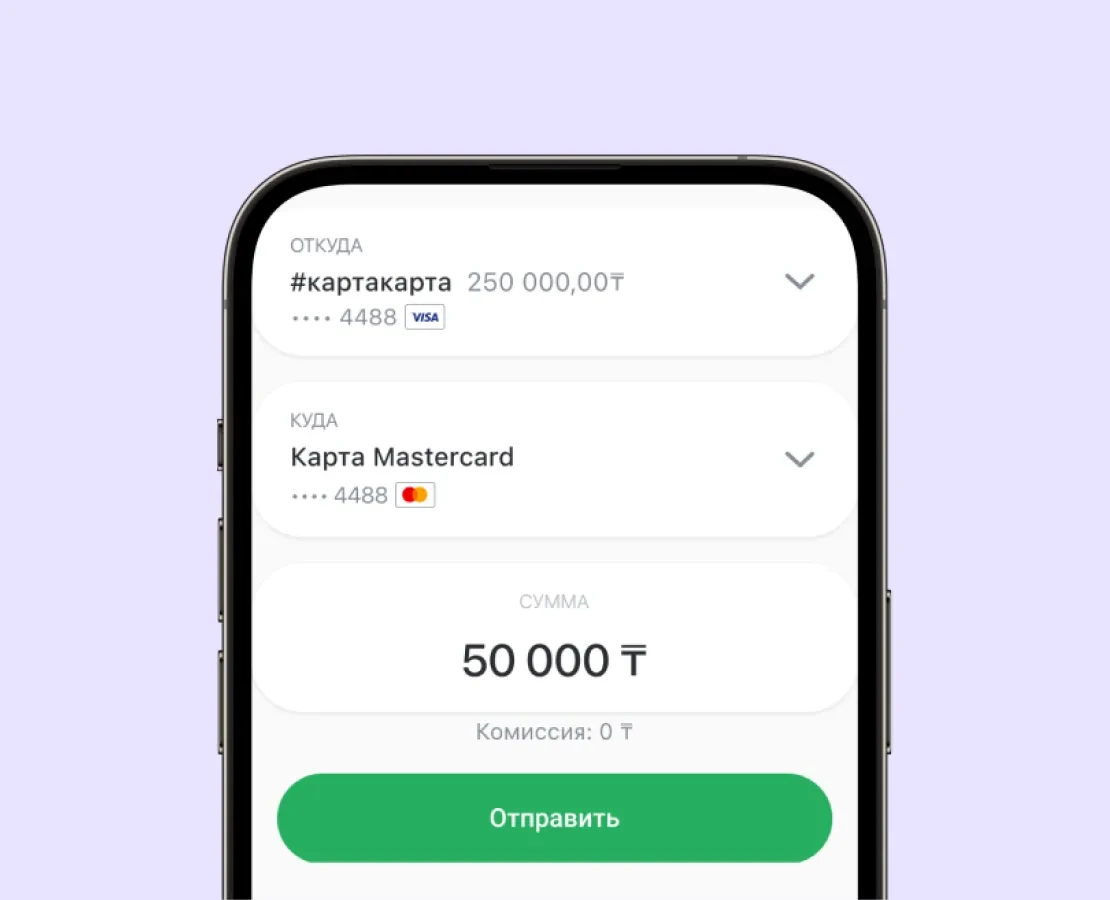* up to 300,000 ₸ per month (by #картакарта credit card: monthly limit for transfers from the card is the general one, regardless of the transfer method)