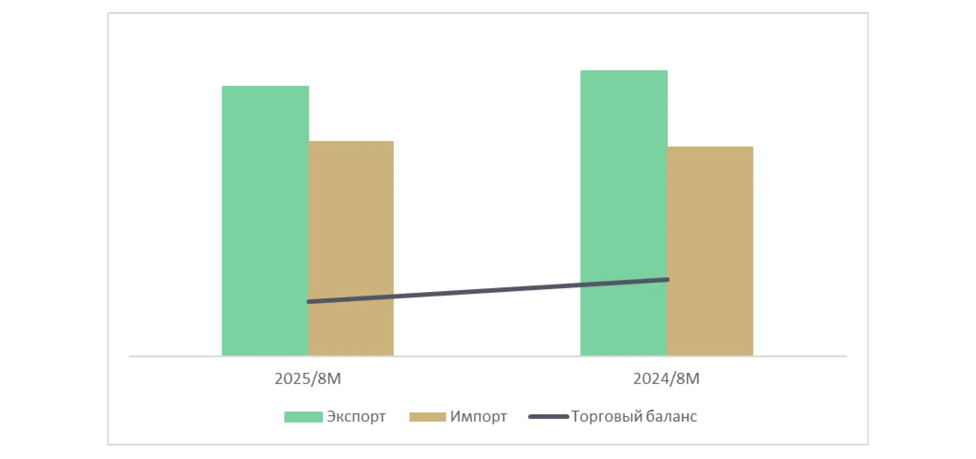 Kazakhstan’s trade balance has traditionally shown a surplus due to substantial oil export volumes. However, in 2025, oil exports generated less foreign currency revenue. According to data for January–August, exports continued to decline (–5.7%) while imports increased (+2.8%) year-on-year. As a result, the trade surplus decreased by 30% to USD 8.9 billion. Excluding oil, the trade balance amounted to –USD 15.7 billion, compared to –USD 14.9 billion a year earlier.