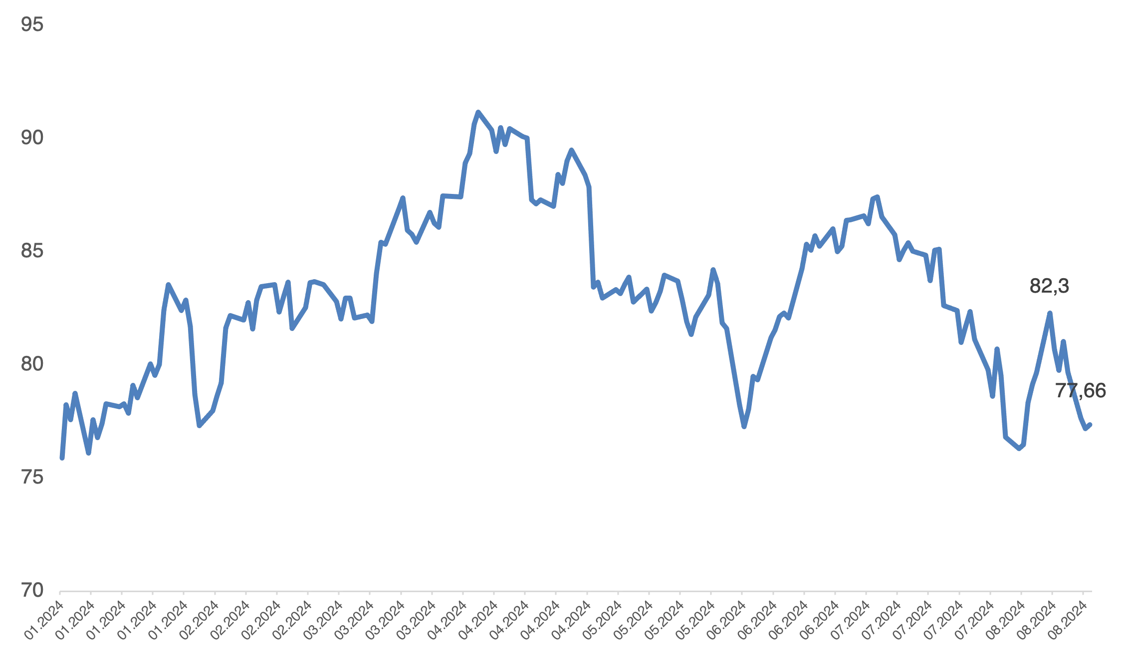 Brent crude oil prices fell to $77 amid a slowdown in the global economy and easing geopolitical tensions. Domestic consumption in China is declining at a record pace, and the U.S. unemployment rate is rising. OPEC and IEA are downgrading their oil demand growth forecasts for 2024-2025, which also puts pressure on the market. Oil prices are expected to decline further, driven by easing geopolitical tensions in the Middle East and a slowdown in global consumption caused by a prolonged period of high base rates. Oil prices, although showing a weak correlation with the KZT exchange rate over the last five years, still may weaken the country's balance of payments in case of further decline, which, in turn, will strengthen devaluation expectations in the FX market.