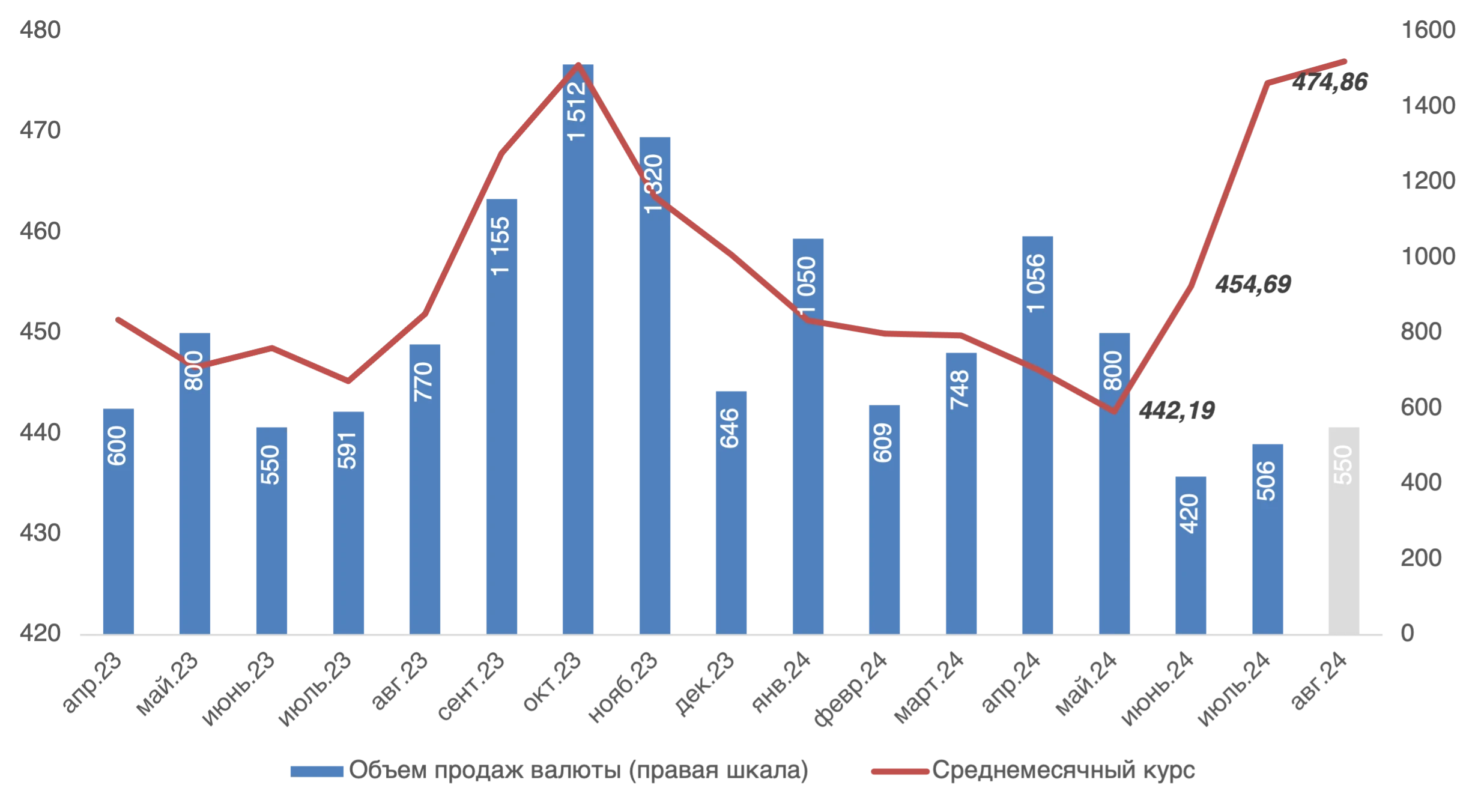 The third quarter kicked off for tenge with some exchange rate stabilization after a noticeable weakening in June. As a result, the average KZT exchange rate weakened by 6.07% by the end of July amid the decline in the National Fund operations in terms of currency sale volume. According to the results of July, foreign currency sales from the National Fund to ensure transfers to the republican budget amounted to $506 mln and about $984 mln as part of selling the currency to purchase Kazatomprom shares. In August, according to the forecasts of the Government, the National Fund will sell currency at similar levels of 500-600 mln. These transactions, in our opinion, support the exchange rate from excessive weakening. As we noted earlier, the level of KZT 480 per US dollar is an attractive level for market participants to sell the U.S. currency.