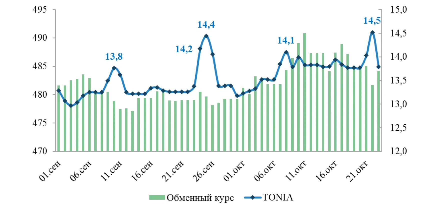 According to the latest incomplete data, the average monthly exchange rate for October 2024 was KZT 485, indicating a depreciation of 5.9% or KZT 27.2 since the beginning of the year. Since the beginning of September, there has been a gradual depreciation of the domestic currency, reaching a peak of KZT 490.8 per 1 USD on October 11, 2024.