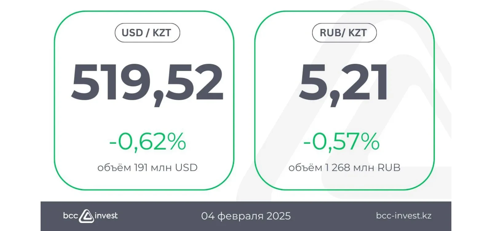 Курс тенге к доллару составил 519,52, продемонстрировав небольшое укрепление на 0,62%. Объём торгов составил 191 млн USD.