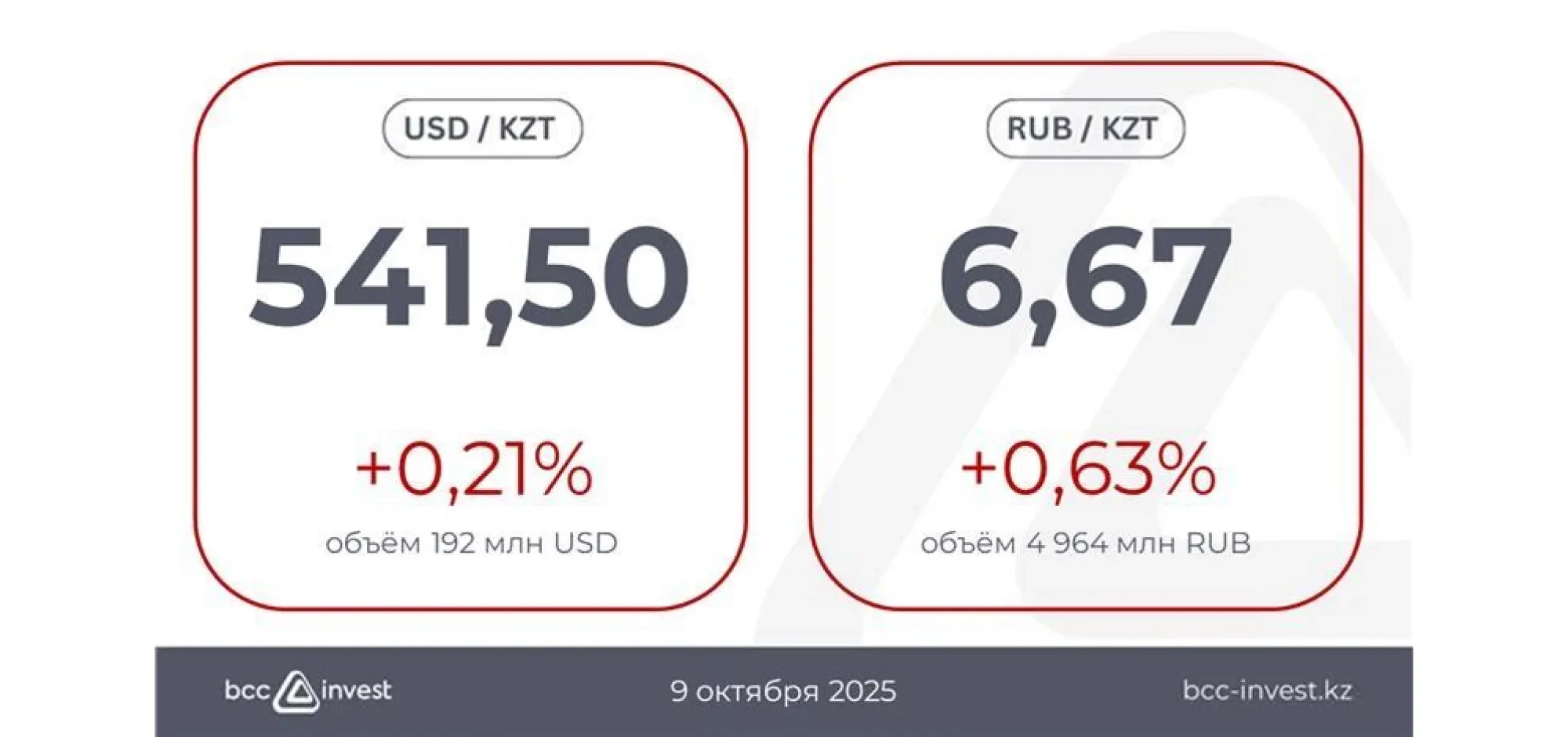 По отношению к рублю курс составил 6,67 ₸ (+0,63%), при этом объём торгов достиг 4 964 млн RUB.