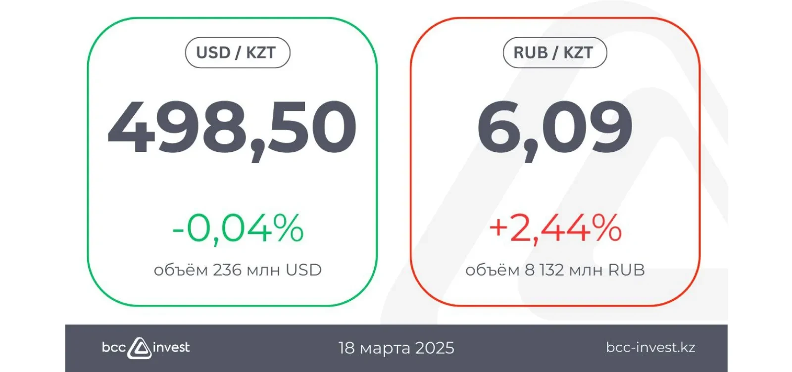 Тенге продемонстрировал незначительное укрепление, снизившись на 0,04% до 498,50 KZT за доллар. Объем торгов составил 236 млн USD.
