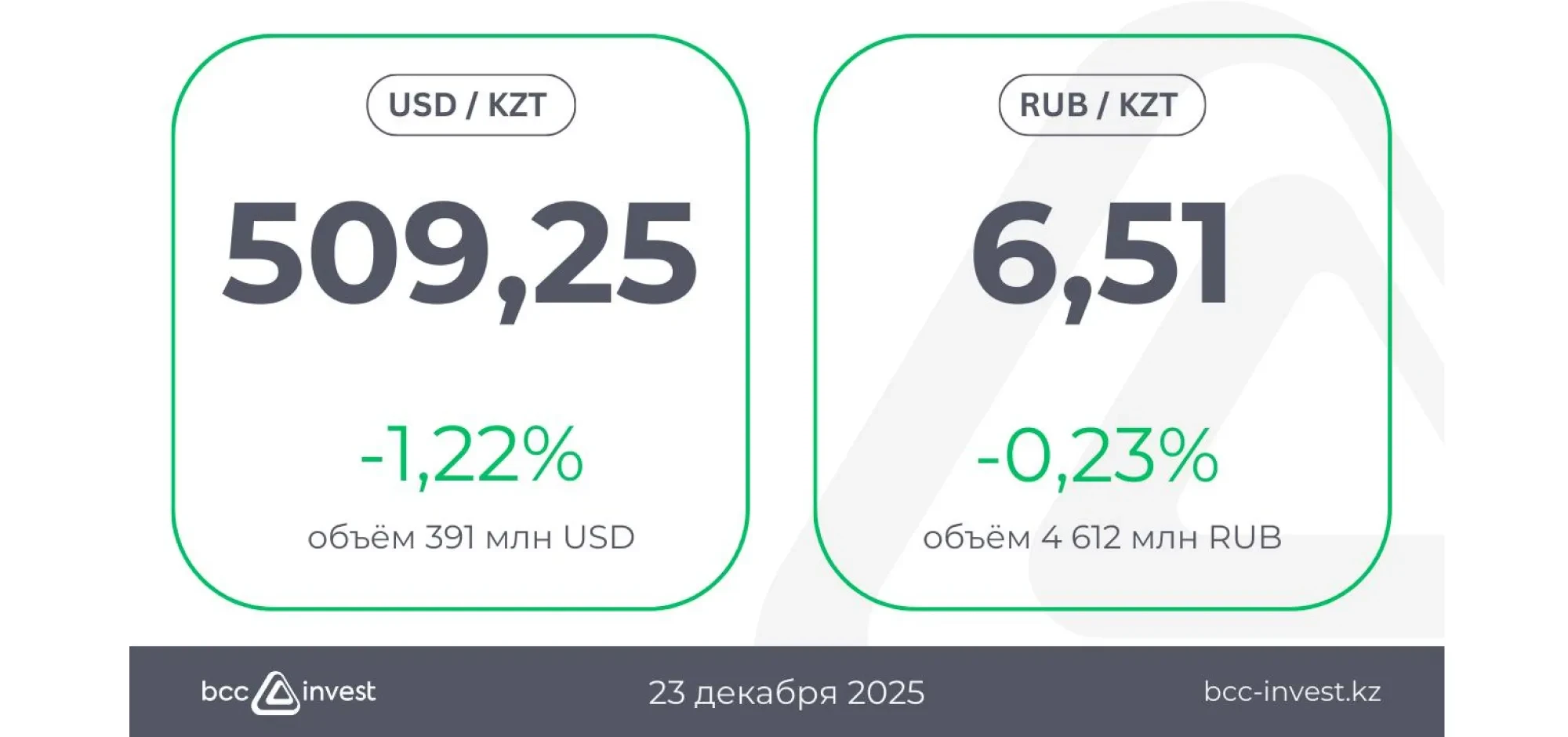 По отношению к рублю курс составил 6,51 ₸ (-0,23%), при этом объём торгов достиг 4 612 млн RUB.