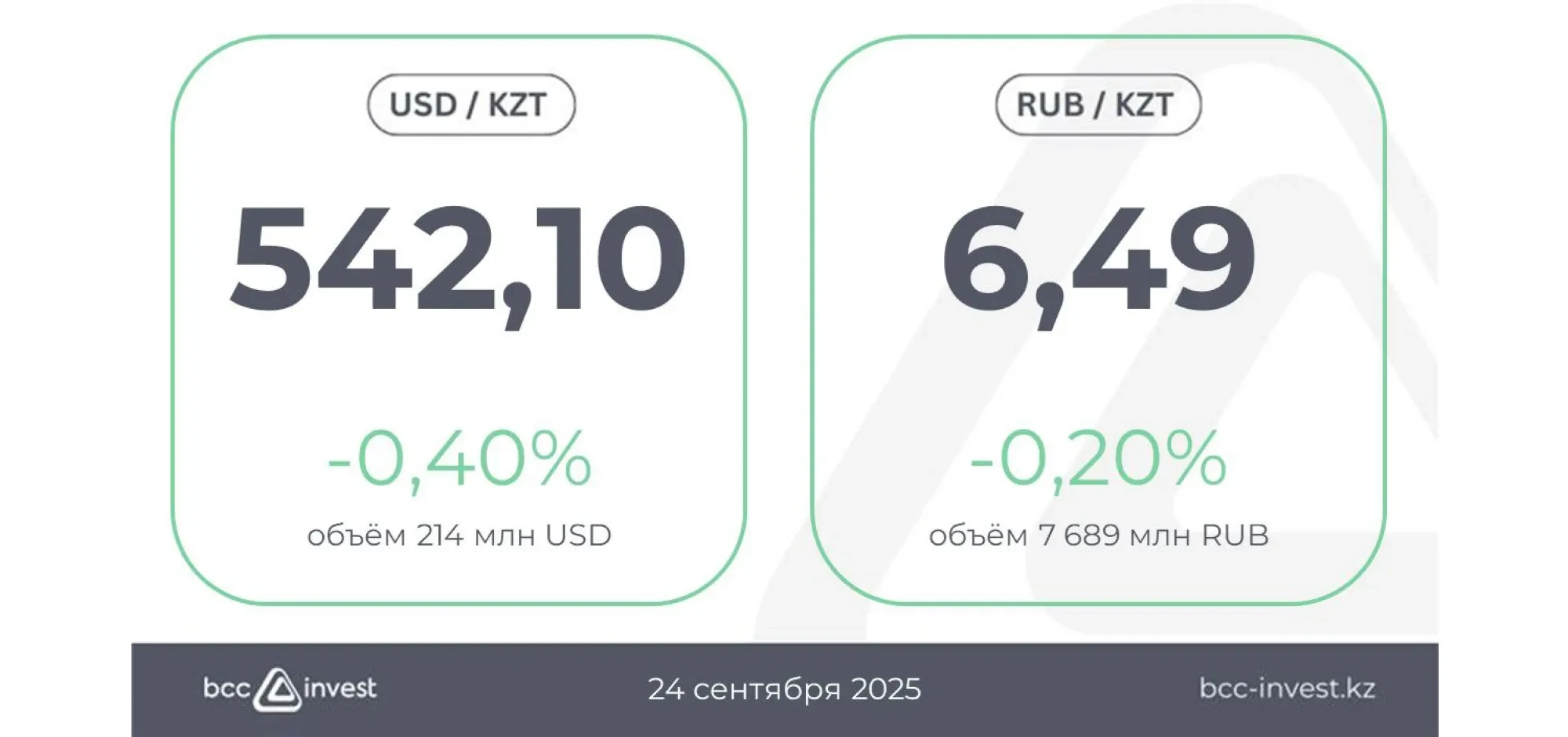 Сегодня тенге укрепился по итогам торгов, завершив сессию на отметке 542,10 ₸ (-0,40%) за доллар, при объёме операций 214 млн USD.