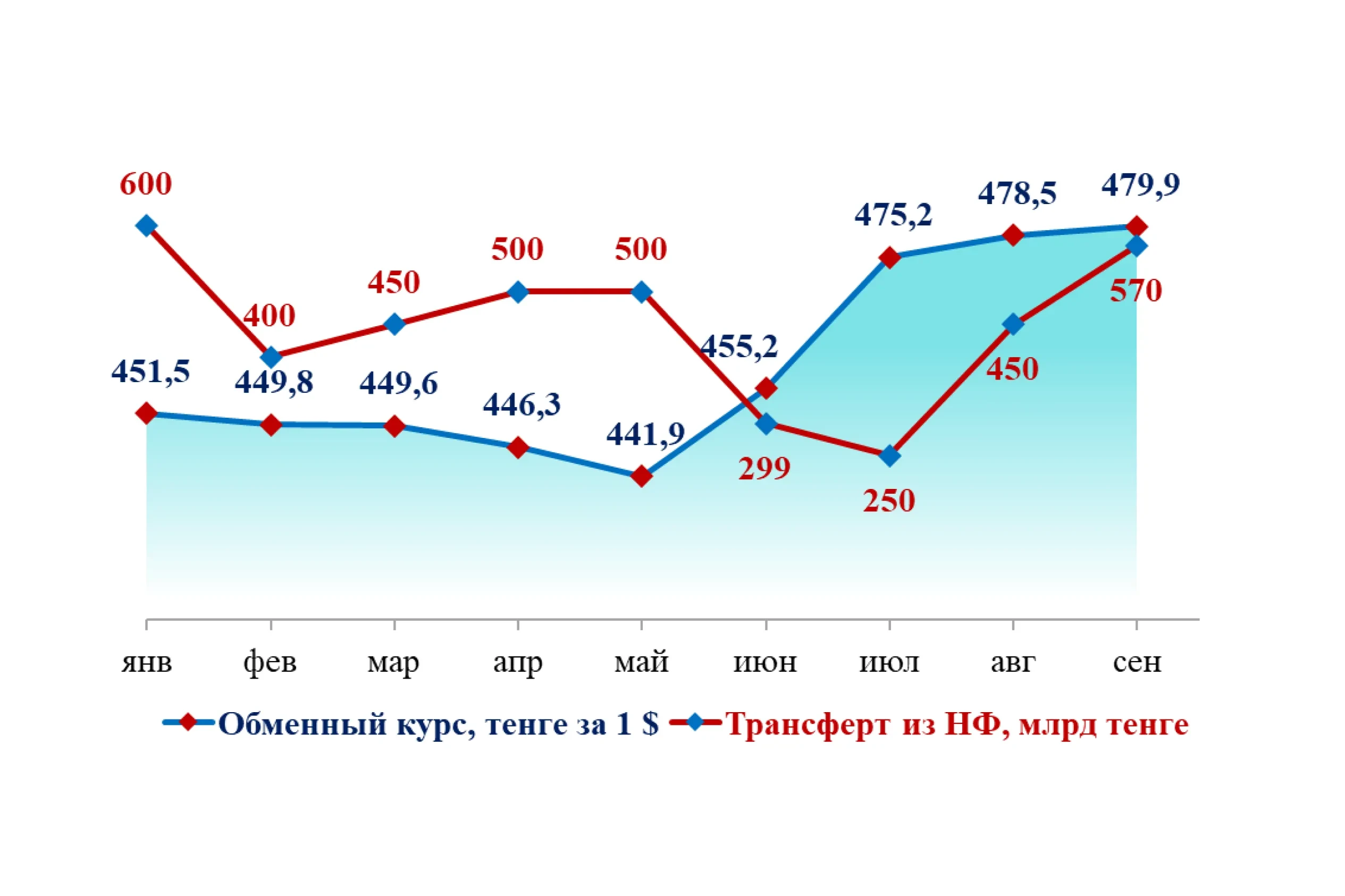 Относительно низкий уровень среднего значения обуславливается благоприятными тенденциями с валютой в начале года. Основное влияние на динамику обменного курса связано с операциями по продаже иностранной валюты Национальным Фондом (далее - НФ). Изъятия из НФ превысили плановые показатели прогноза социально-экономического развития Республики Казахстан от 3 сентября 2024 года (далее – ПСЭР) на 300,4 млрд тенге по итогам 8 месяцев т.г., где объем трансфертов за 2024 год должен был составить 3,6 трлн тенге. При этом согласно заявлению Председателя НБРК от 11 сентября 2024 года имеется неопределенность в отношении дальнейшего изъятия средств из НФ на цели покрытия дефицита бюджета страны, что вызывает рост риска проинфляционного давления и ещё большего снижения эффективности денежно-кредитной политики государства.