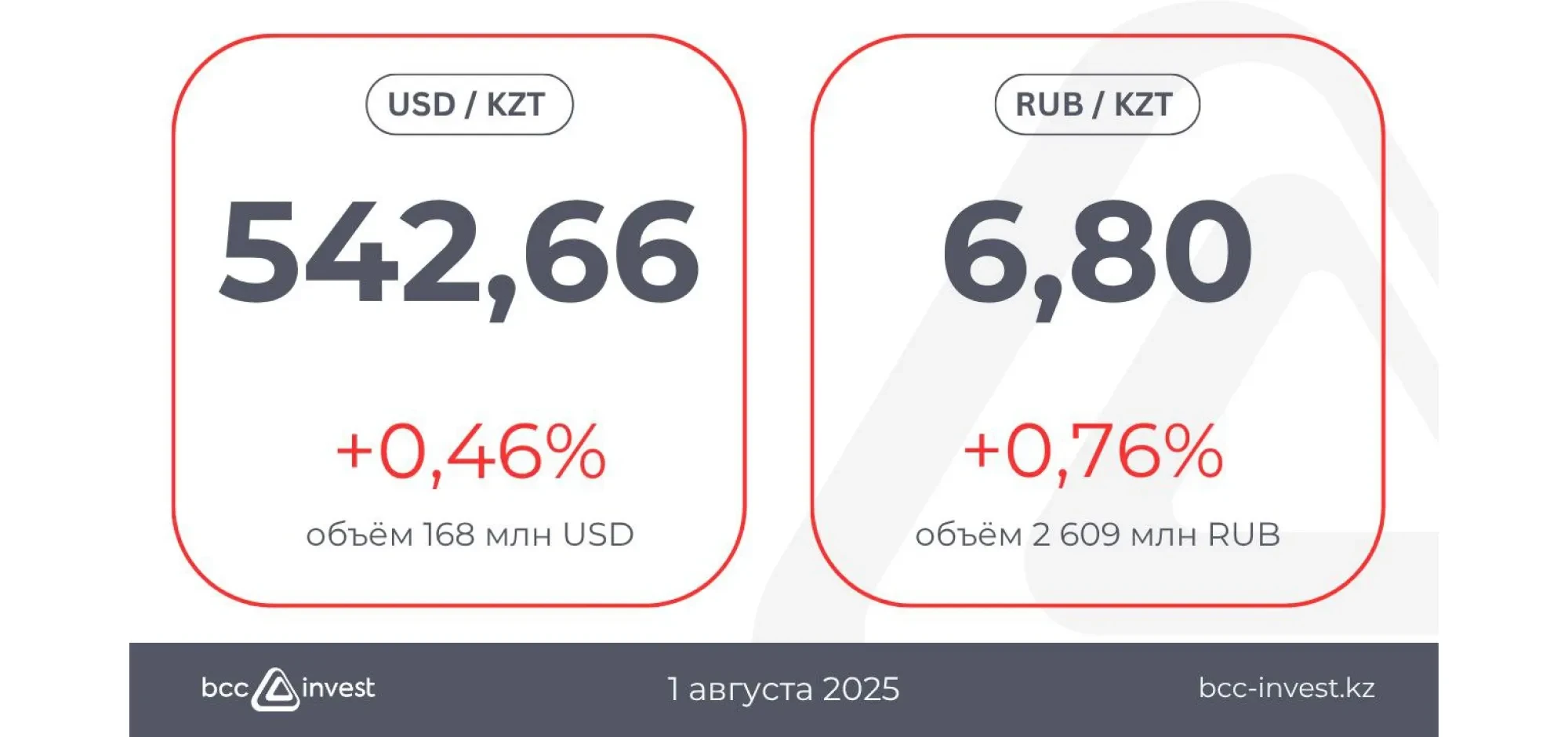 В первый день августа тенге вновь ослаб по отношению к доллару, завершив сессию на уровне 542,66 ₸ за доллар (+0,46%). Объём торгов составил 168 млн USD, что ниже уровня предыдущих дней.