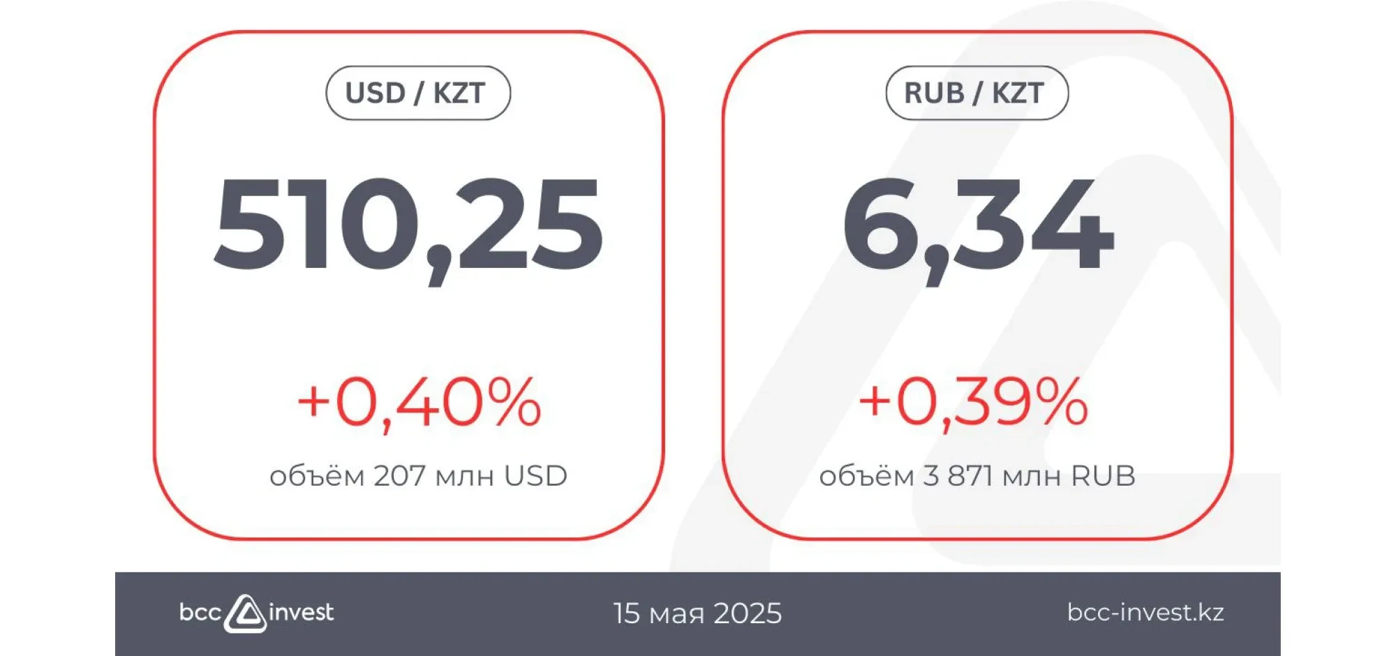 Курс тенге продемонстрировал умеренное ослабление до 510,25 (+0,40%), объёмы торгов средние, 207 млн USD.