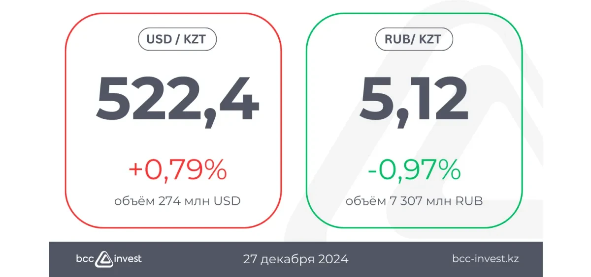 Курс USD/KZT вырос до 522,4 (+0,79%), продолжая рост второй день подряд, в то время как RUB/KZT демонстрирует умеренное снижение до 5,12 (-0,97%).