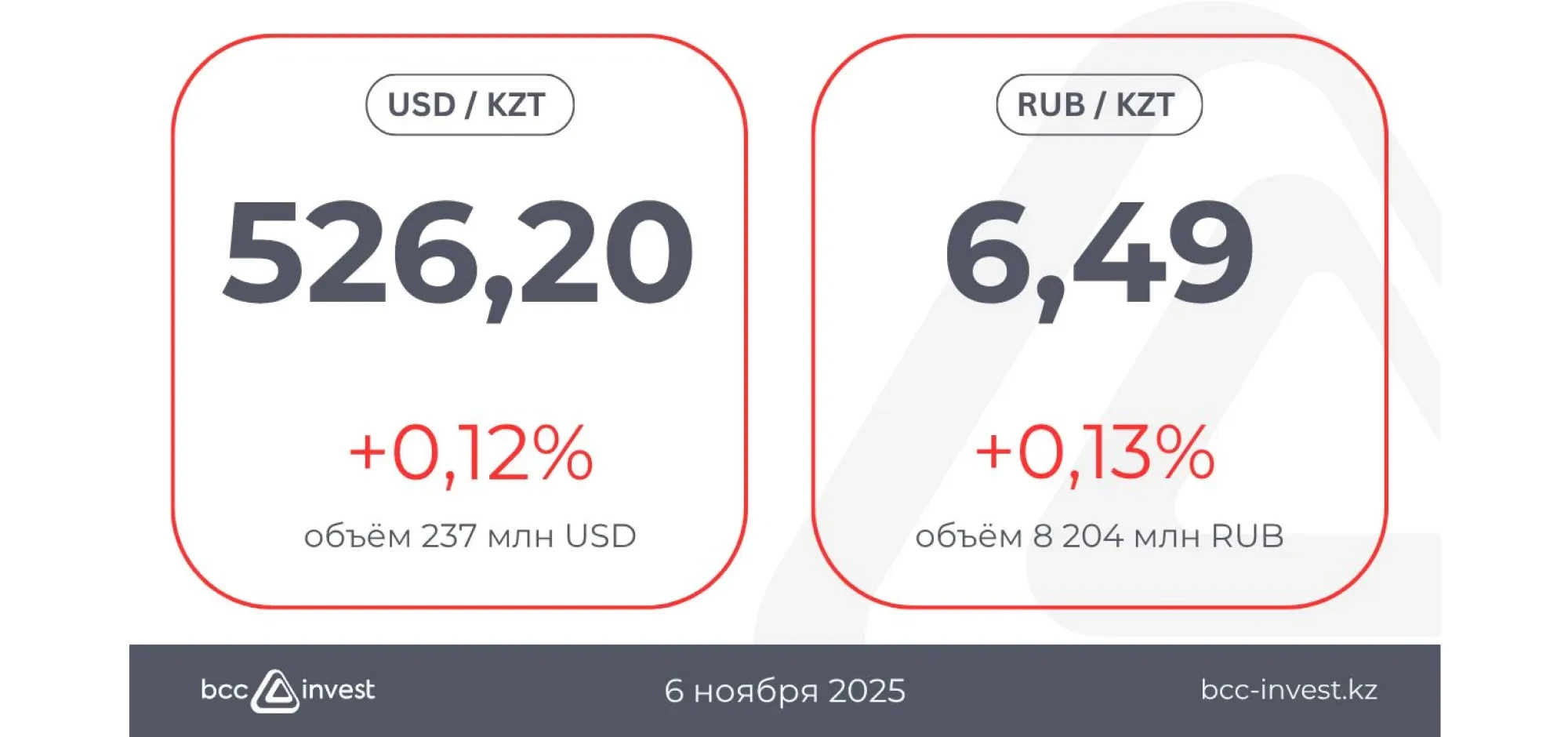 По отношению к рублю курс составил 6,49 ₸ (+0,13%), при этом объём торгов достиг 8 204 млн RUB.