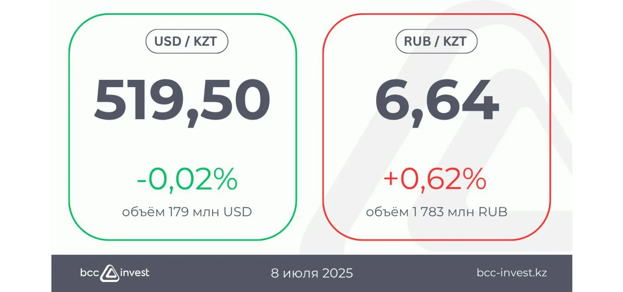 Бүгінгі сауданың нәтижесінде теңге іс жүзінде өзгермеді: курс 519,50 теңгені құрады (−0,02%). Ал рубль 6,64 теңгеге дейін өсті (+0,62%).