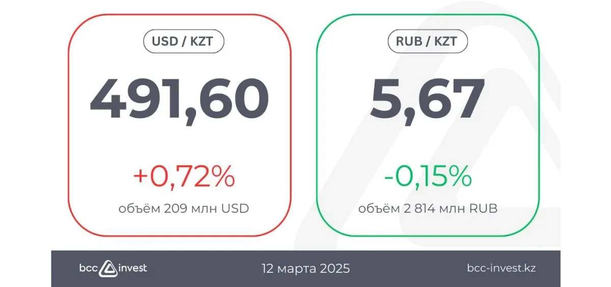Теңге 209 млн USD сауда көлемі кезінде бір доллар үшін 491,60 (+0,72%) дейін аздап әлсірегенін көрсетті.