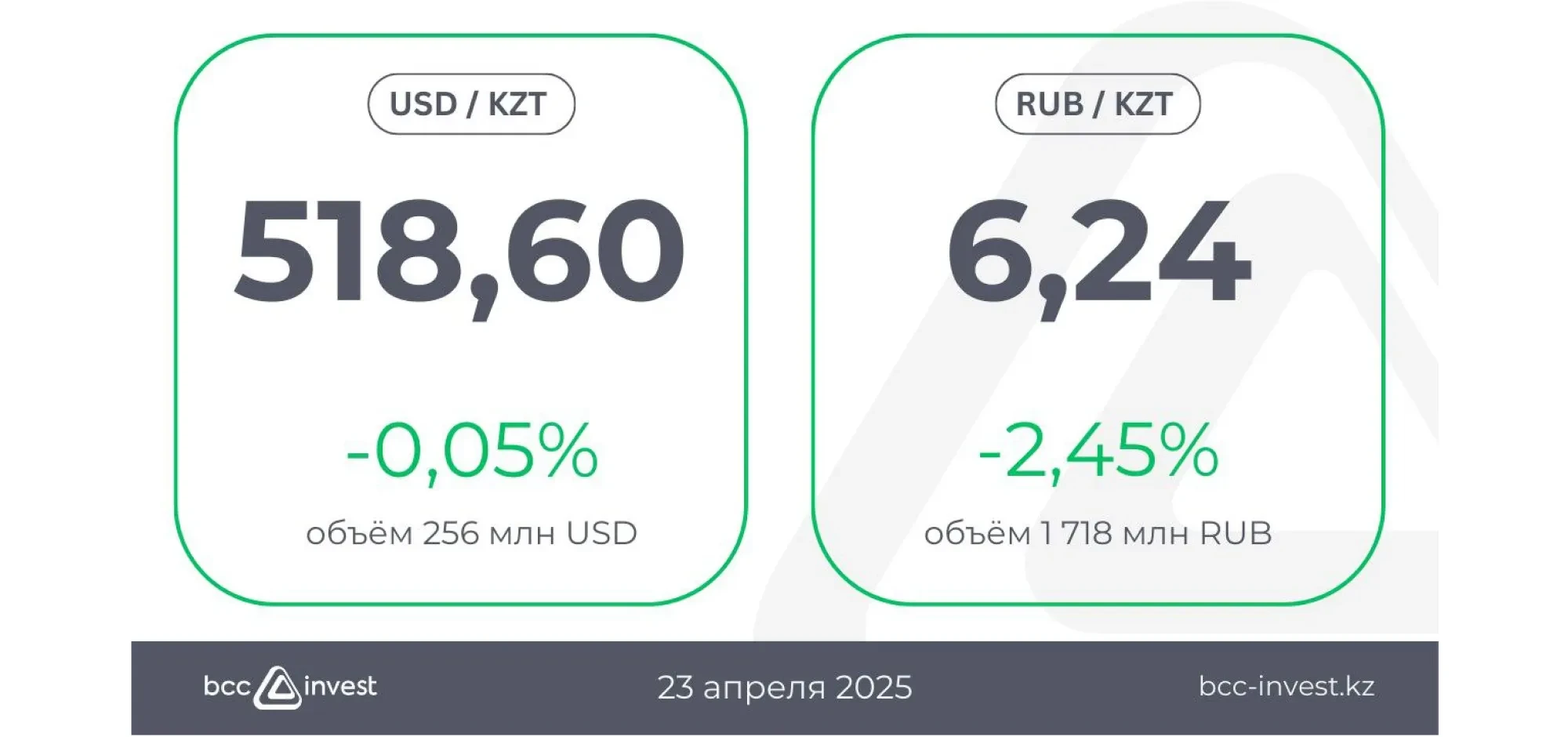 Теңге сауда сессиясын аздаған нығаюмен аяқтады. 2025 жылғы 23 сәуірде USD/KZT бағамы 518,60 деңгейіне дейін төмендеп, 0,05%-ға әлсіреді. Сауда көлемі орташа деңгейде – 256 млн АҚШ долларын құрады.