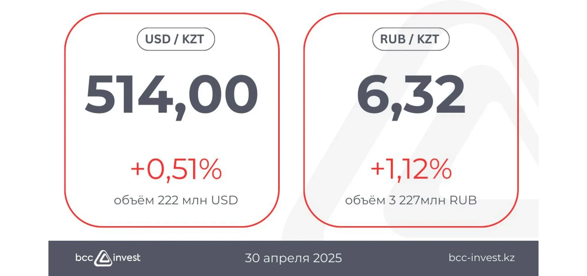 Бүгінгі сауда-саттық қорытындысы бойынша USD/KZT бағамы 514,00-ге дейін өсіп, күніне 0,51% - приб құрады. Сауда көлемі 222 млн АҚШ долларын құрады.