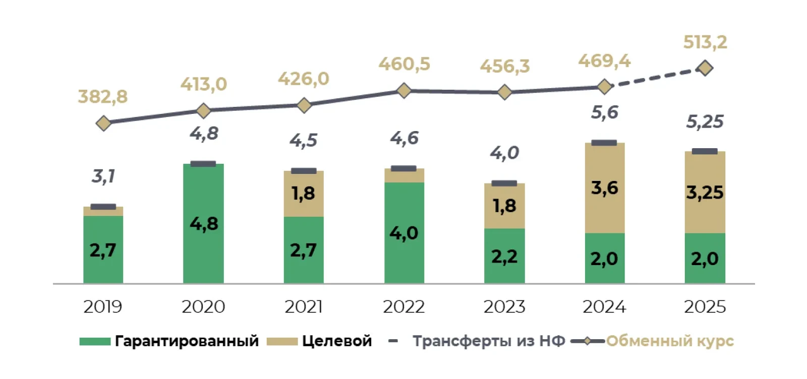 ҰБ валюталық интервенциялары есебінен, мемлекеттік резервтерді пайдалану арқылы іске асыралатын шаралар кешені айырбастау бағамына қолдау көрсетеді. Бұл процестегі негізгі рөл – Ұлттық қордн (бұдан әрі – ҰФ) қаражатты пайдалану. 2025-2027 жылдарға арналған республикалық бюджет туралы заңға сәйкес ағымдағы жылы ҰҚ-тағы жалпы сомасы 5,25 трлн теңгені құрайтын қаражатты пайдалану қарастырылған, оның ішінде 2 трлн теңге – бұл кепілдендірілген трансферт және 3,25 трлн теңге – бұл нысаналы трансферт.