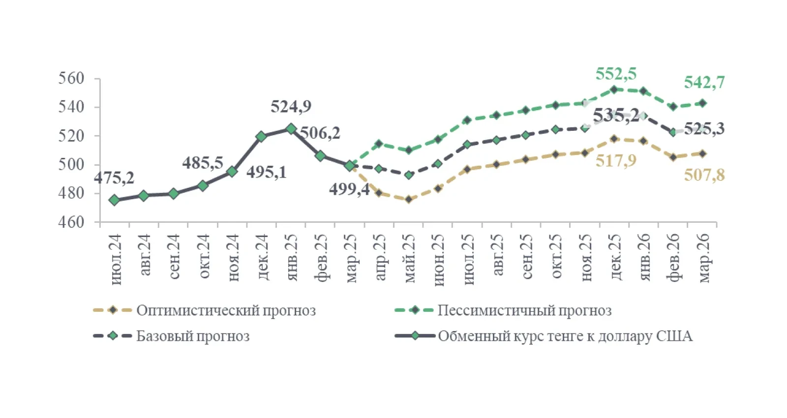 Жаңартылған базалық сценарийге сәйкес келесі екі айда орташа айлық айырбастау бағамының біртіндеп нығаюы күтіледі, содан кейін жыл соңында бағамның ең жоғары деңгейге дейін әлсіреуі және одан әрі нығаюы күтіледі. Мәселен, 2025 жылдың сәуір және мамыр айларында орташа айлық айырбастау бағамы тиісінше 1 АҚШ доллары үшін 497,4 теңге және 492,9 теңге деңгейінде болжанады. 2025 жылғы желтоқсанда бағам 1 АҚШ доллары үшін 535,2 теңге деңгейінде күтіледі. 12 болжамды айдан кейін орташа айлық айырбастау бағамы (2026 жылғы наурызда) 525,3 теңгені құрайды деп күтіледі.