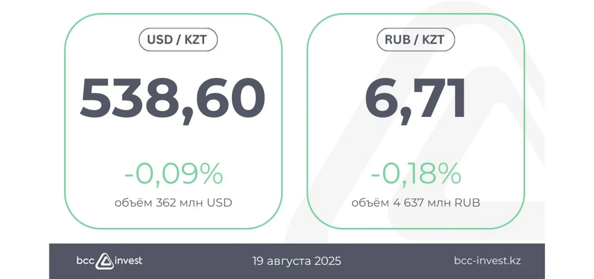 Бүгінгі сауданың қорытындысы бойынша теңге нығайды: доллар бағамы 0,09%-ға төмендеп, 538,60 теңге деңгейінде бекіді, сауда көлемі 362 миллион АҚШ долларын құрады.