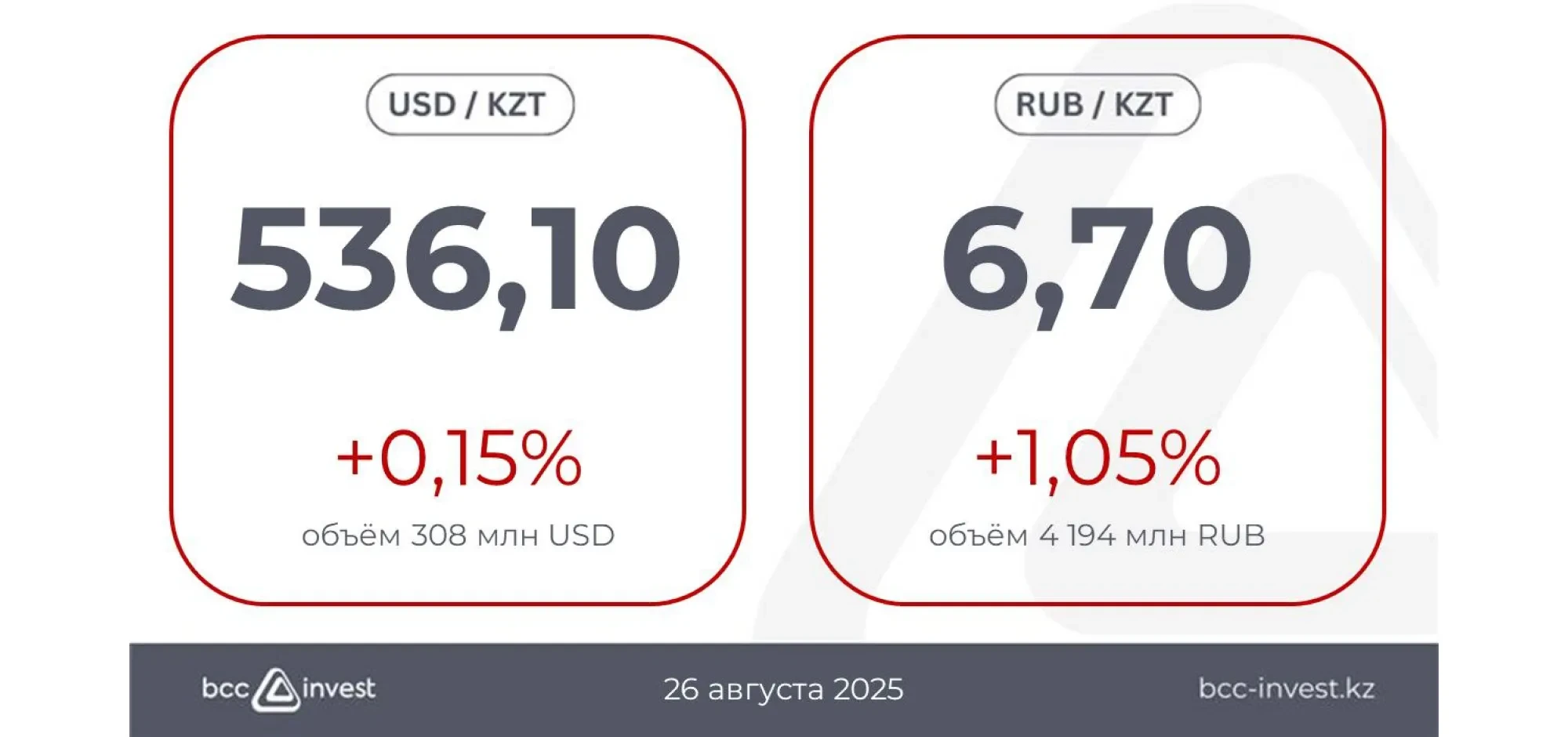 Рубльге қатысты курс 6,70 теңгені құрап, +1,05%-ға көтерілді, сауда көлемі 4 194 миллион рубль болды.