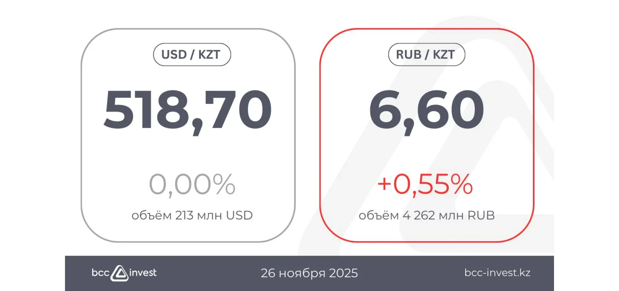 Рубльге қатысты курс 6,56 ₸ (-0,81%) деңгейінде қалыптасты, сауда көлемі 4 873 млн RUB-қа жетті.