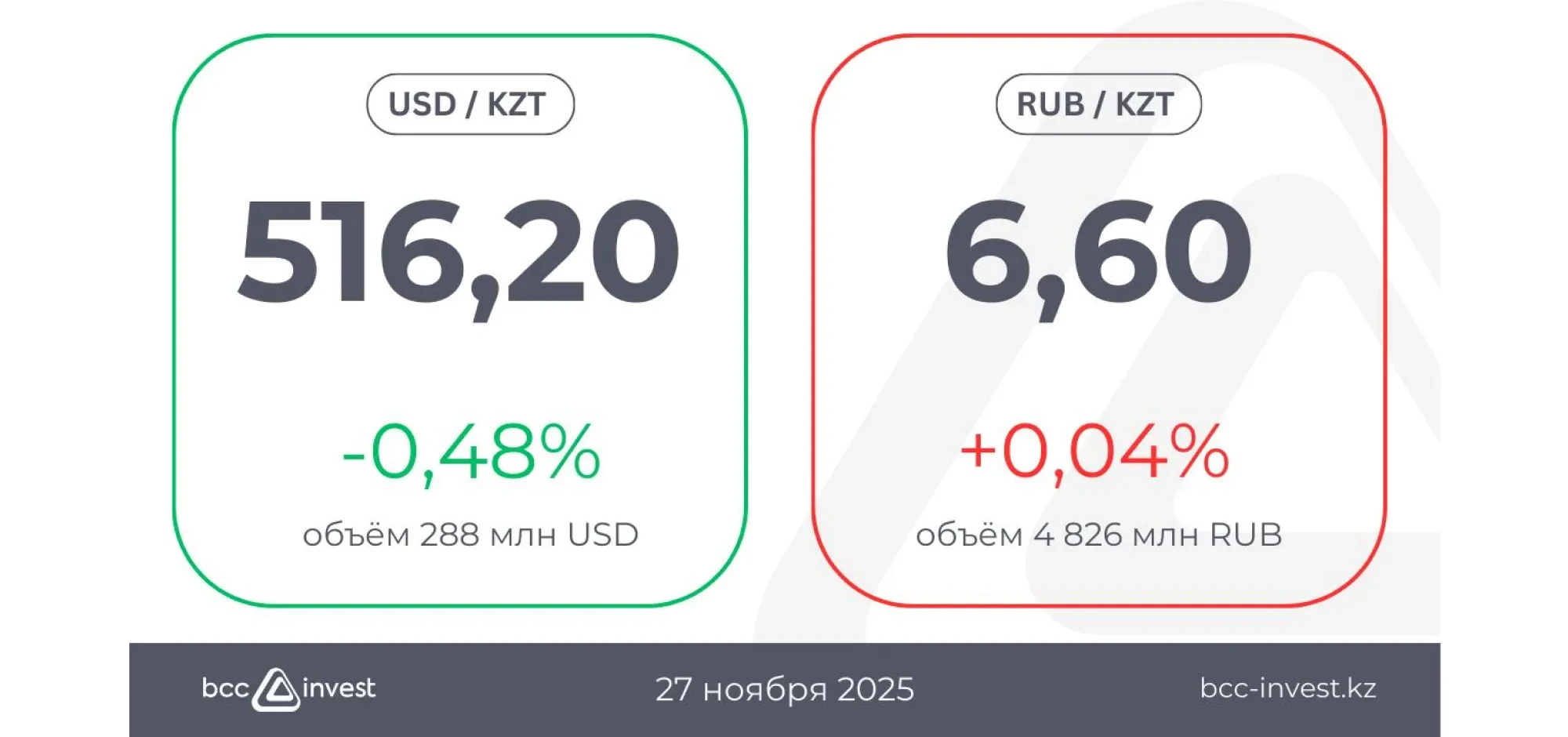 Бүгінгі сауда қорытындысы бойынша теңге нығайып, сессияны доллар үшін 516,20 ₸ (-0,48%) деңгейінде аяқтады, операциялар көлемі 288 млн USD болды.