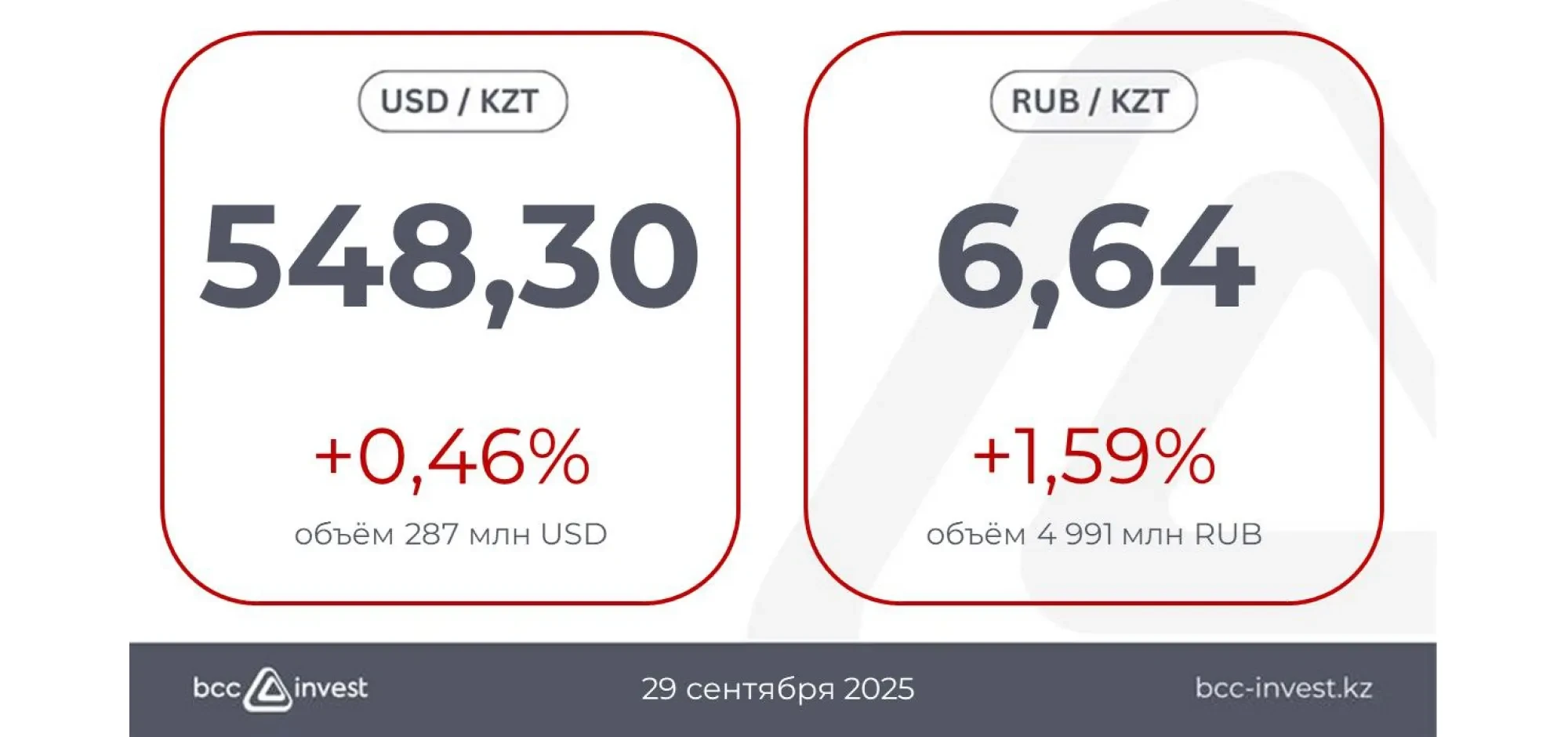 Рубльге қатысты бағам 6,64 теңгені (+1,59%) құрады, бұл ретте сауда көлемі 4 991 млн рубльге жетті.