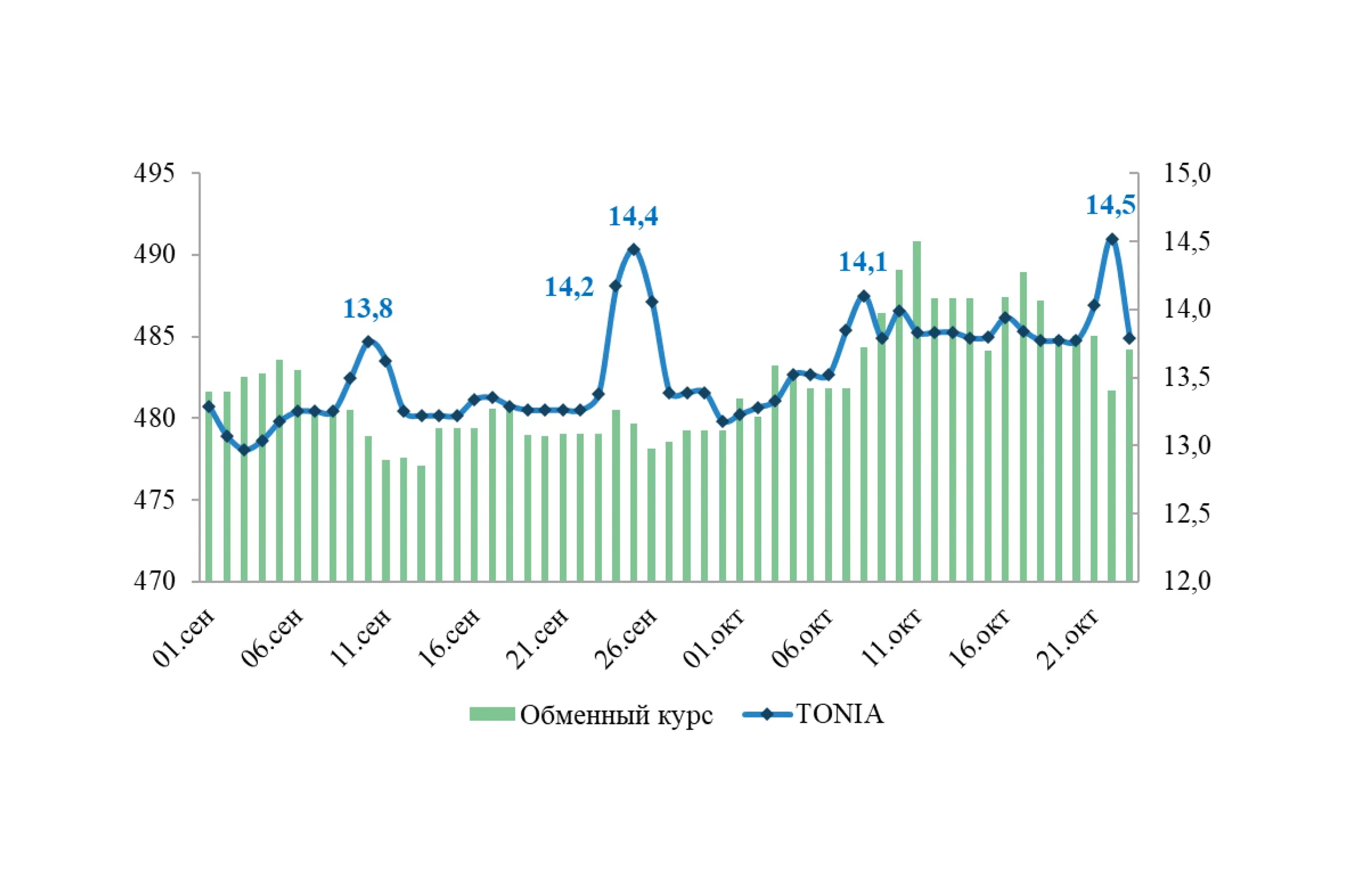 Ағымдағы жағдайларда, теңге бағамына АҚШ долларына қарай қысқамерзімді бағыт бере алатын нарықтық озыңқы индикатор рөлін РЕПО операциялары бойынша кірістілік атқара алады. Қыркүйек айының соңында біз TONIA индексінің кірістілігі 13,38%-дан 14,44%-ға дейін күрт өскен кезде, бағамның 0,4%-ға немесе 1,96 теңгеге одан әрі нығайғанын байқадық. Осыған ұқсас көрініс, индикатор 13,77%-дан 14,52%-ға дейін өсіп, бағам 1,5%-ға немесе 7,25 теңгеге нығайғандағы соңғы тенденциялар бойынша да байқалады. Жыл басынан бастап ағымдағы жылдың 23 қазанына дейінгі кезеңдегі корреляция коэффициенті (-)38% құрады, бұл айнымалылар арасындағы теріс бірқалыпты байланысты көрсетеді.