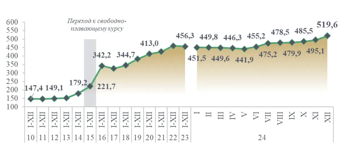 ҰБ деректері бойынша 2024 жылдың басынан 2024 жылғы 31 желтоқсанға дейін айырбас бағамы 14,8%-ға немесе 67,2 теңгеге, 1 АҚШ доллары үшін 454,56 теңгеден 521,81 теңгеге дейін әлсіреді. Ұлттық валюта теңгенің АҚШ долларына қатысты нашарлау динамикасы көптеген фактордың ықпалымен қалыптасады, бұл негізінен шикізат экспорттауға және дайын өнімдерді импорттауға бағытталған елдің экономикалық ерекшелігіне байланысты. Сыртқы экономикалық қызметтің мұндай құрылымы теңгені жаһандық және ішкі жағдайлардың өзгеруіне осал етеді, бұл жағдайларды шартты түрде сыртқы және ішкі факторларға бөлуге болады.