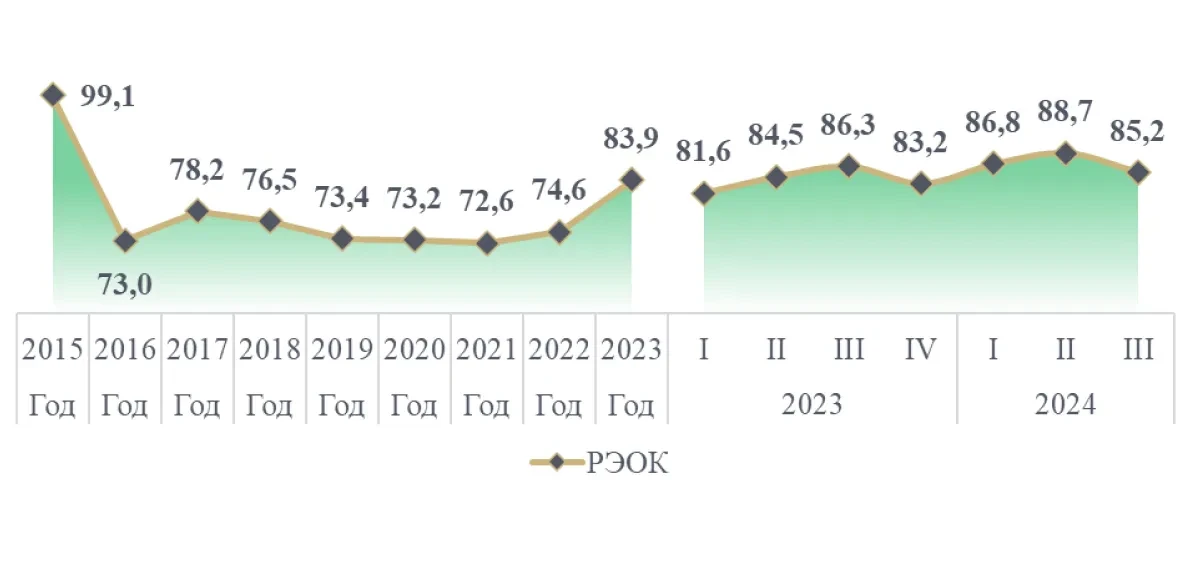 2024 жылға арналған деректер валюта бағамының нығаюын көрсетеді, көрсеткіш екінші тоқсанда 88,7-ге жетіп, үшінші тоқсанда 85,2-ге дейін аздап төмендеді. Бұл мемлекет қаржысы есебінен тікелей немесе жанама түрде қаржыландырылған фискалдық импульспен байланысты. Бағамның нығаю үрдісі елдің бәсекеге қабілеттілік позицияларының жақсарғанын көрсетеді, алайда әрі қарай орнықты нығаю ішкі макроэкономикалық тұрақтылықты қолдауды талап етеді және ҰҚ-тың жиі араласуына себеп болуы мүмкін.