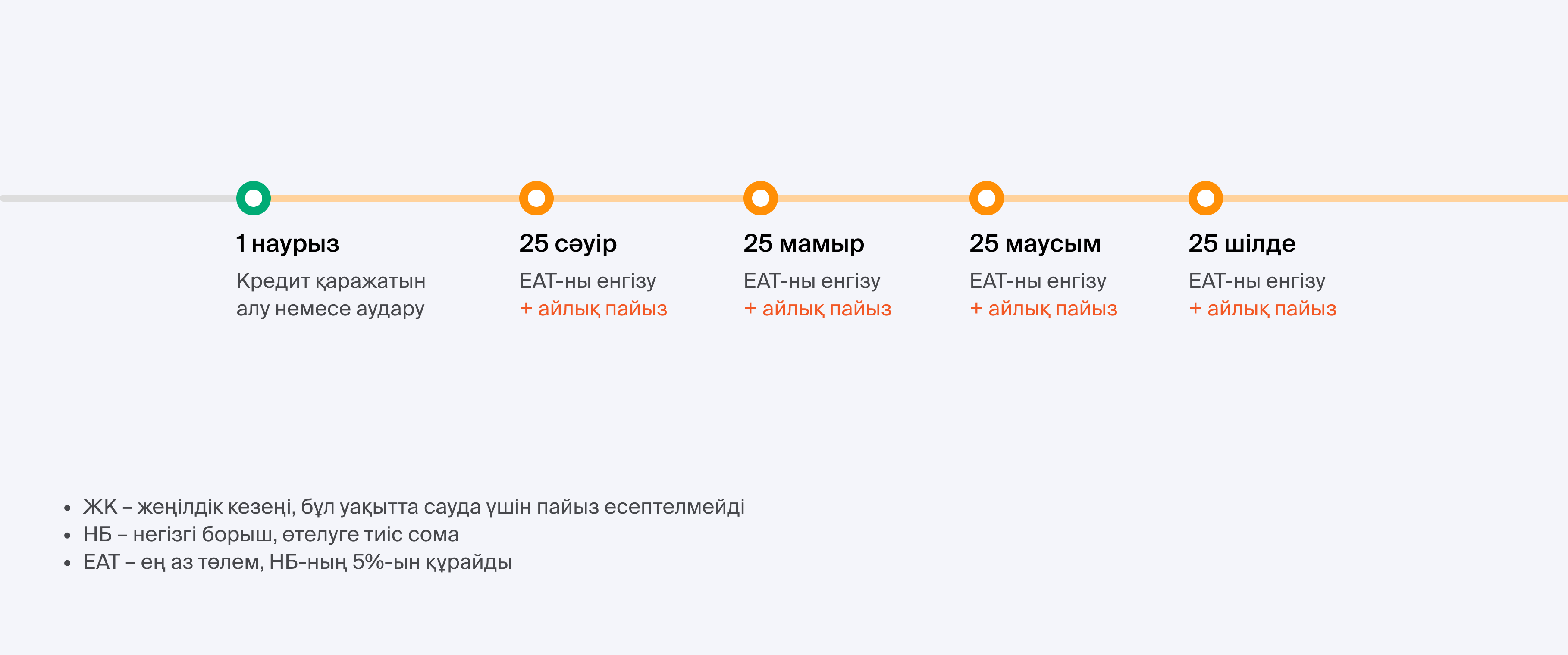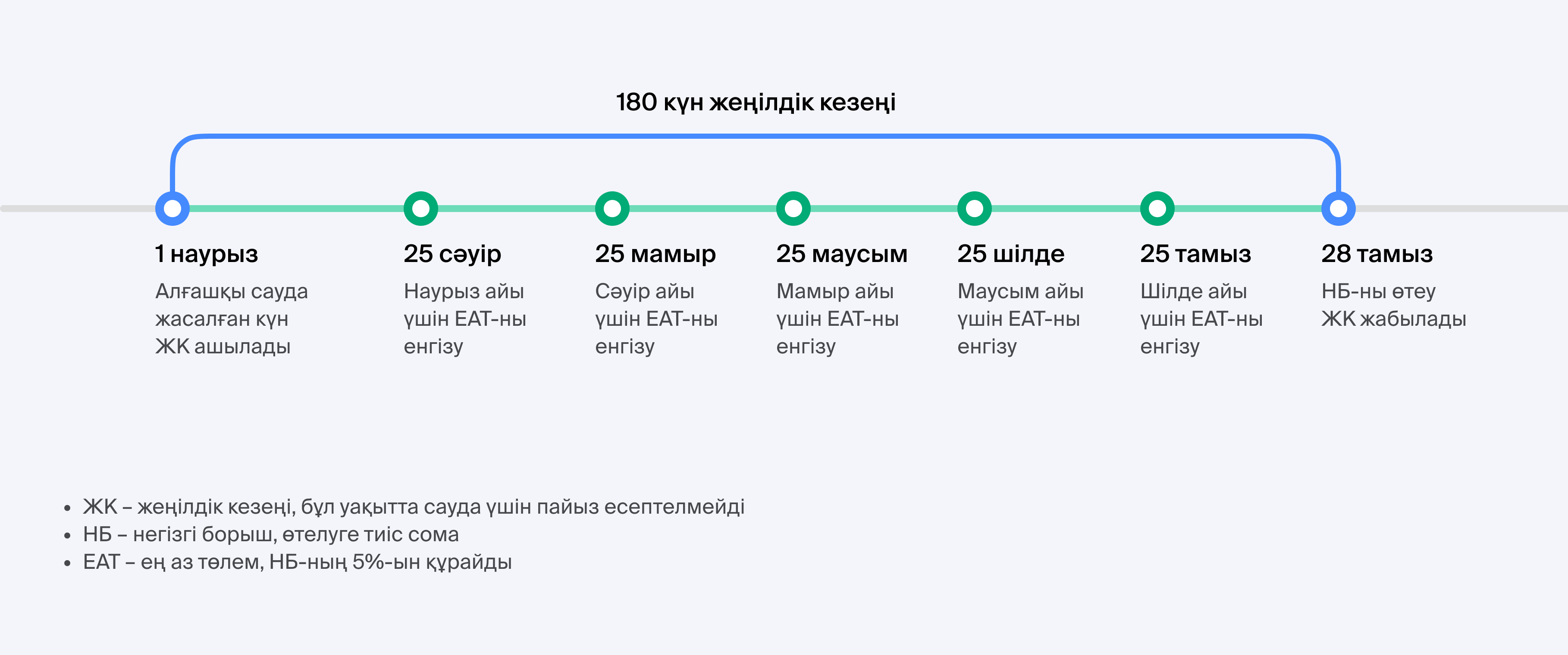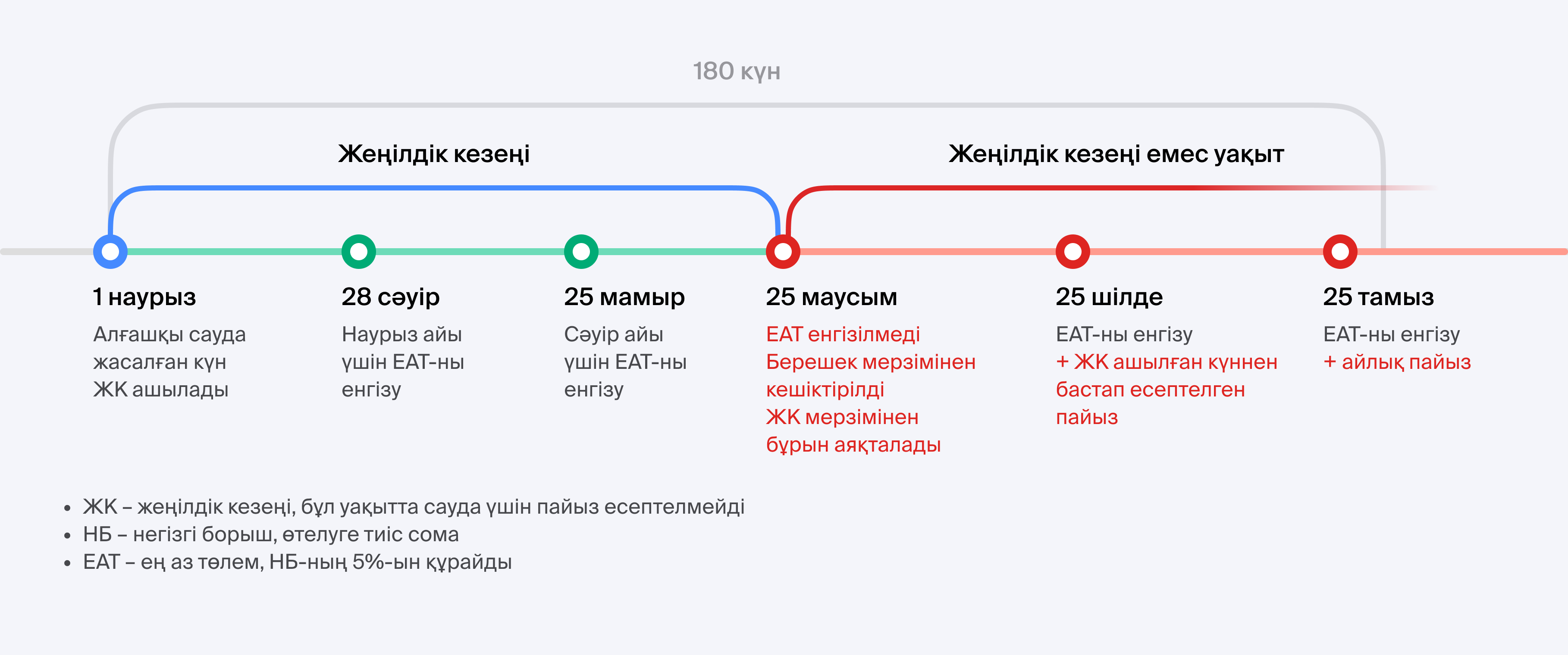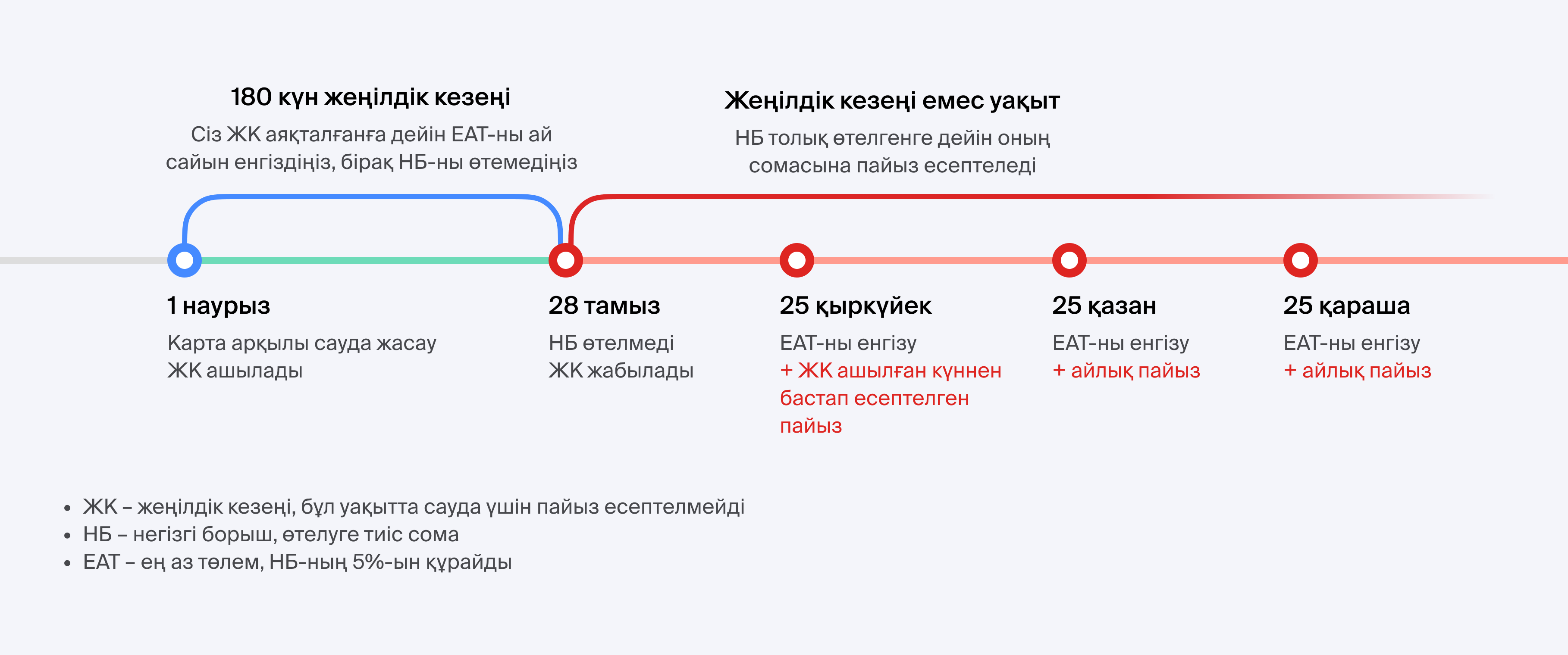 - 180 күннің соңында жеңілдікті кезең аясында пайдаланылған қарызды толығымен өтеңіз.