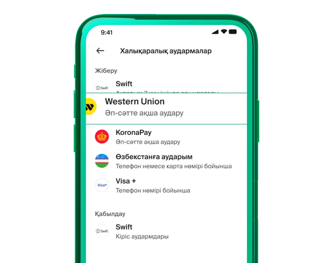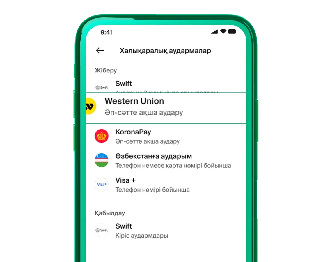* Алушының банк шотына аударымды әлемнің 50-ден астам еліне жіберуге болады және география үнемі кеңейіп отырады. Нақты бір елге жіберу мүмкіндігін Вестерн Юнион жүйесінің бағдарламалық қамсыздандыруында нақтылау қажет.