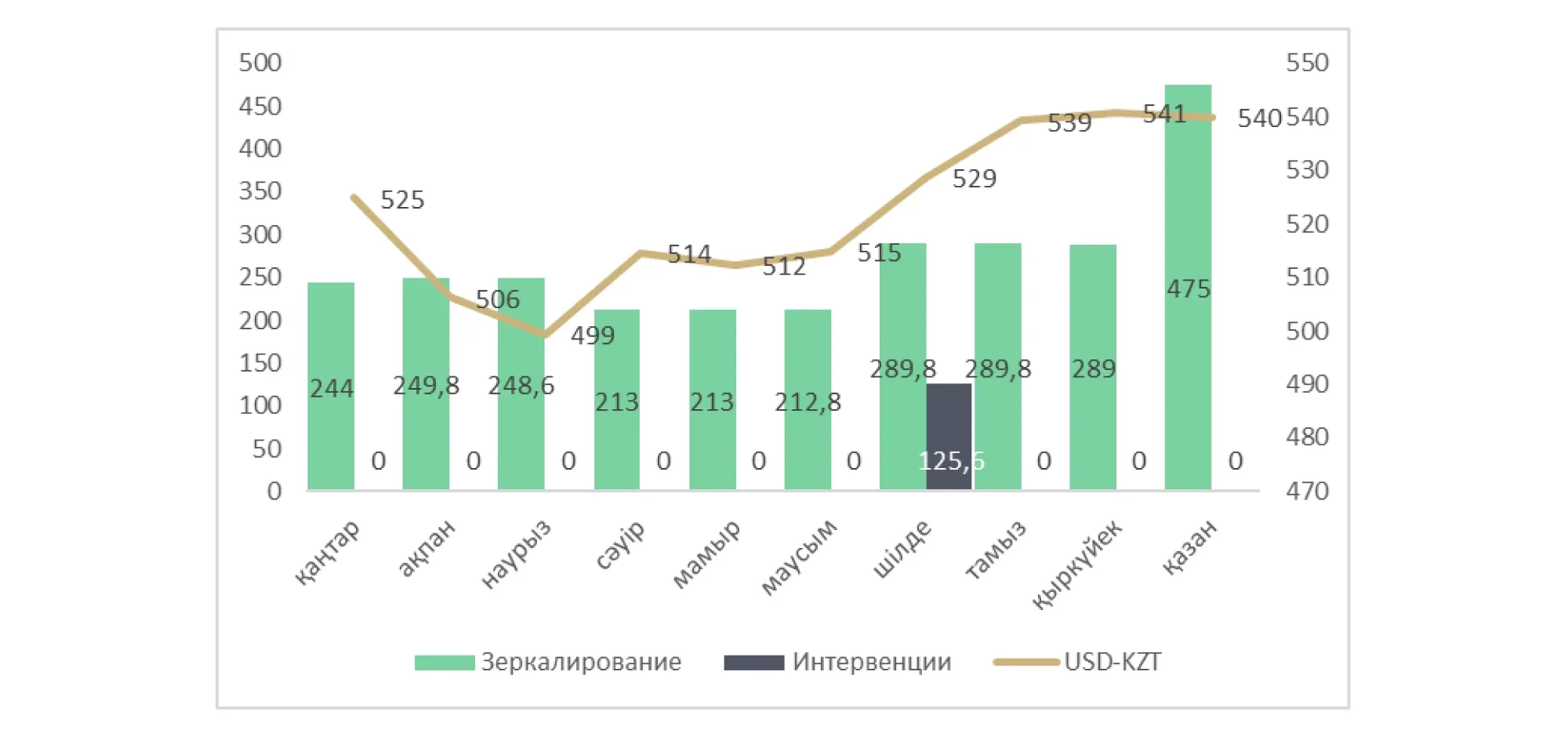 Есепті айда Ұлттық банк тікелей валюталық интервенциялар жүргізген жоқ. Дегенмен «айна» операциялары аясында 475 млрд теңге көлемінде өтімділік азайтылды. Бұл қыркүйектегі көрсеткіштен (290 млрд теңге) айтарлықтай жоғары және айырбастау бағамының нығаюына әсер еткен негізгі факторлардың бірі болды.