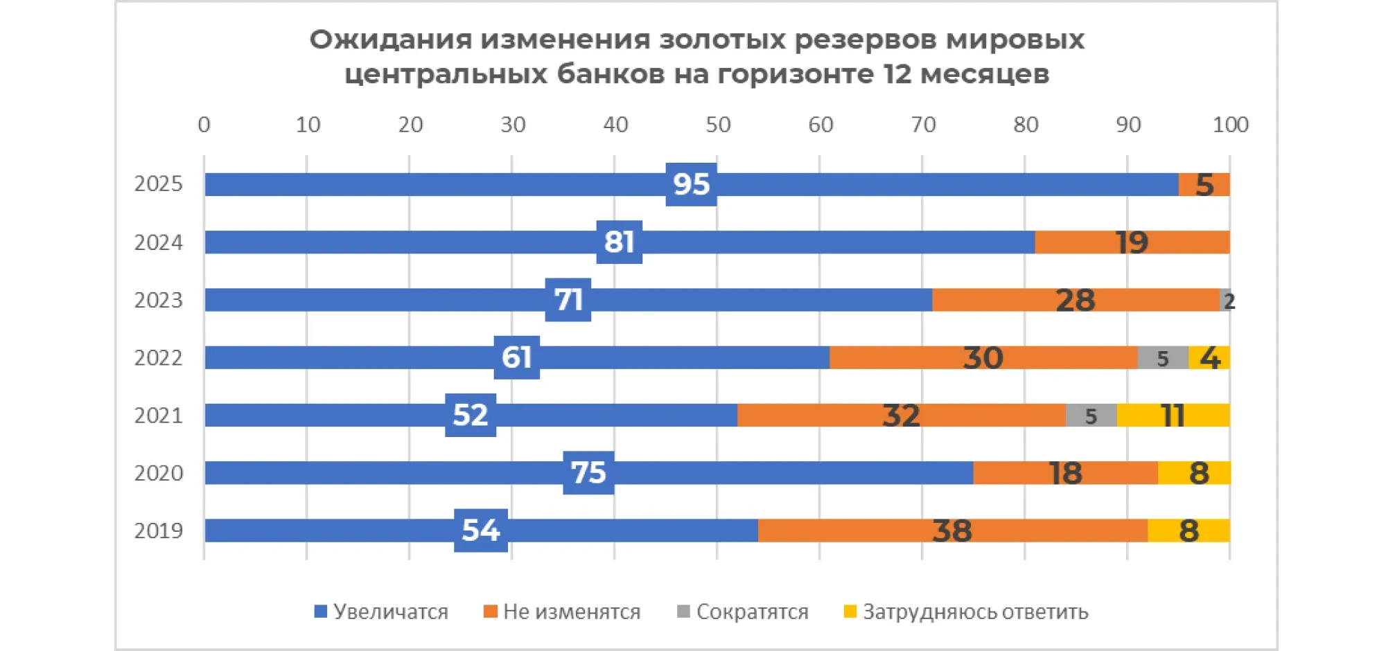 Сондықтан орталық банктердің 95%-ы жақын арадағы 12 айда әлемдік алтын резервтері өседі деп күтеді (былтыр бұл көрсеткіш 81% болған). Ең таңқаларлығы — респонденттердің рекордтық 43%-ы бір жыл ішінде меншікті алтын-валюта резервтерін ұлғайтуды жоспарлап отыр, сондай-ақ ешбір қатысушы оларды қысқартатынын мәлімдемеген.