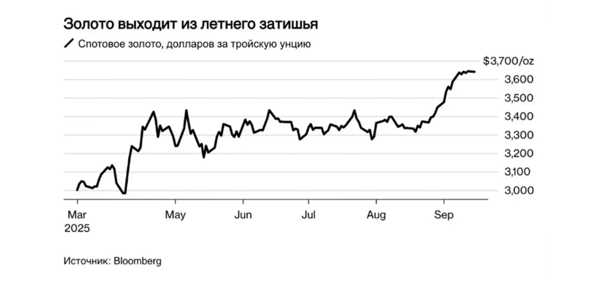 Қыркүйек айының басында бағам алғаш рет бір унция үшін 3 600 АҚШ долларына жетіп, үш жыл бұрынғы шамамен 1 800 АҚШ доллары деңгейімен салыстырғанда екі есеге жуық өсті. Маусым айының соңына қарай алтын бір унция үшін шамамен 3 275 АҚШ доллары деңгейінде саудаланып, тоқсан басымен салыстырғанда 7%-ға, ал бір жыл бұрынғы көрсеткішпен салыстырғанда 25%-ға қымбаттады. Осылайша алтын өсімі бойынша көшбасшылардың біріне айналды: жыл басынан бері оның құны шамамен 25%-ға артып, бірнеше рет жаңа рекорд орнатты. Алтын нарығындағы раллидің негізгі қозғаушы факторлары геосаяси жағдайдың тұрақсыздығы мен монетарлық саясаттың өзгеруі болды.