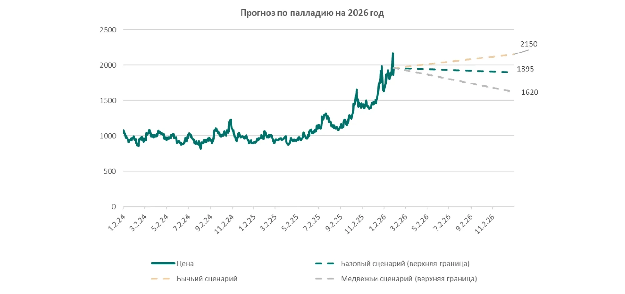 С точки зрения рыночного консенсуса (Bloomberg, на 28.01.2026), ожидания по палладию на конец 2026 года остаются сдержанными: медианный прогноз на 4кв26 — около $1 357/унц., при диапазоне оценок от $1 100 до $2 100. Отдельные крупные дома закладывают более «низкую» траекторию уже по кварталам 2026 года: например, JPMorgan в своих оценках указывает снижение к $1 150 в 4кв26, Morgan Stanley около $1 250, тогда как более оптимистичный взгляд у Commerzbank (порядка $2 100 на 4кв26) и ряда других участников, которые допускают более устойчивые цены при сохранении геополитической премии и/или перебоях поставок.
